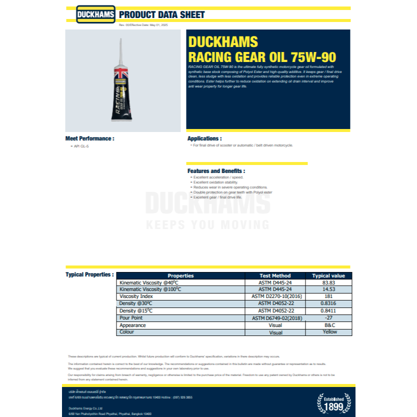 น้ำมันเกียร์เฟืองท้าย DUCKHAMS RACING GEAR OIL 75W90 Polyol Ester สังเคราะห์แท้100% รถมอเตอร์ไซค์ สกู๊ตเตอร์ ออโตเมติก