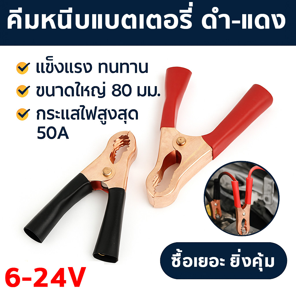 ?(1 คู่) คลิปปากจระเข้ ดำ-แดง หุ้มฉนวน 50A 80 ยาว มม.คลิปหนีบโลหะสำหรับ รถยนตร์ รถบรรทุก ตัวเชื่อม