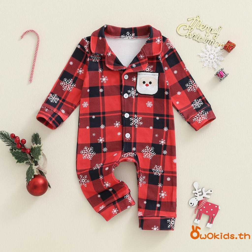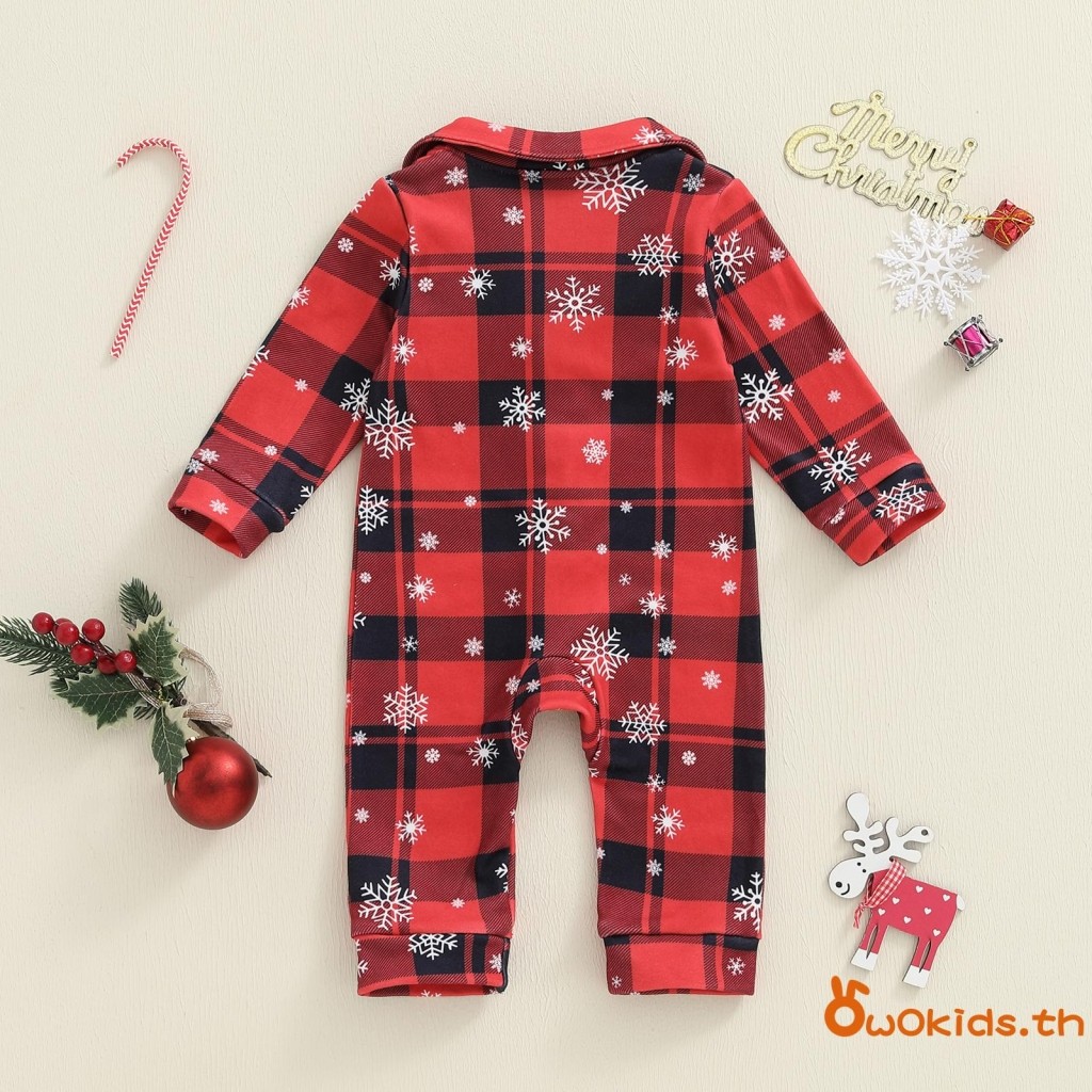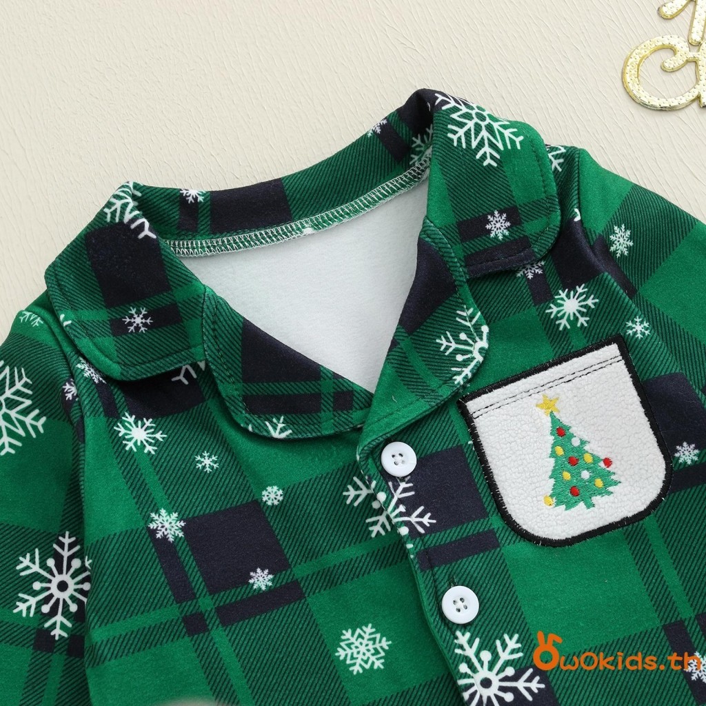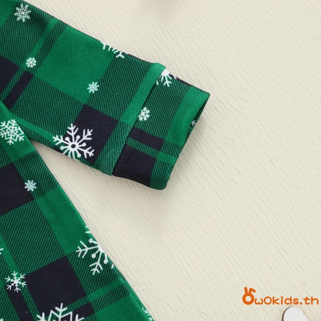 ชุดนอนเด็กคริสต์มาส แบบสก๊อตกับเกล็ดหิมะ ออกแบบคอวีแขนยาว