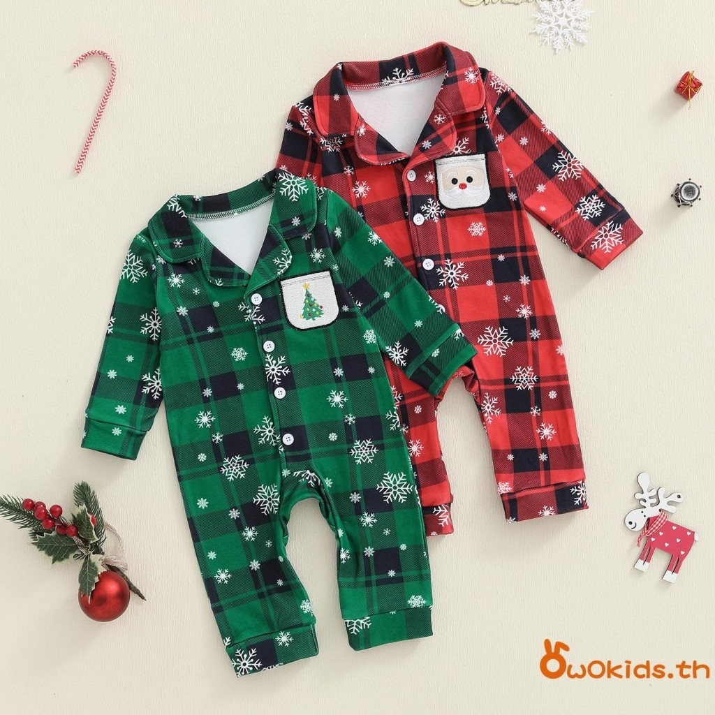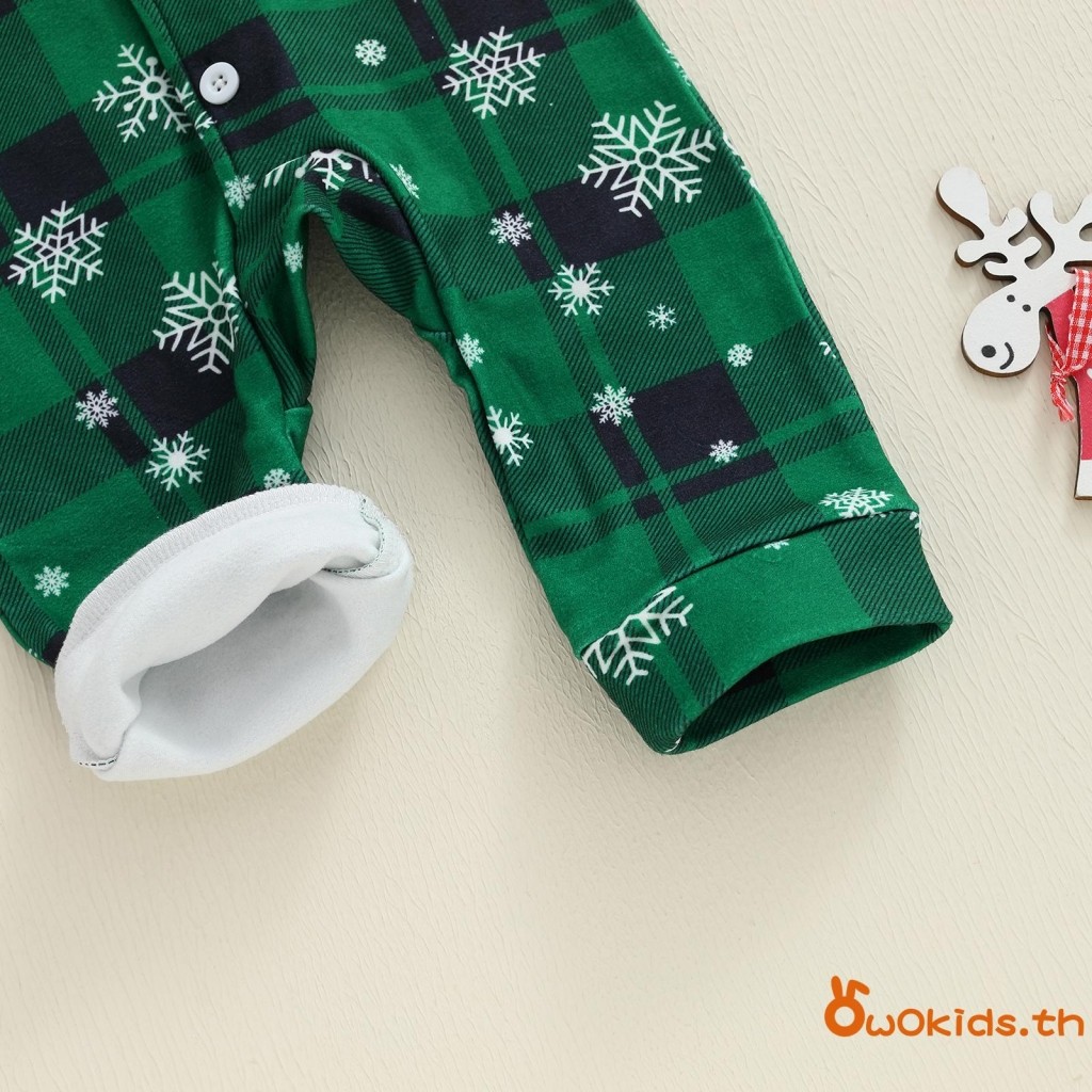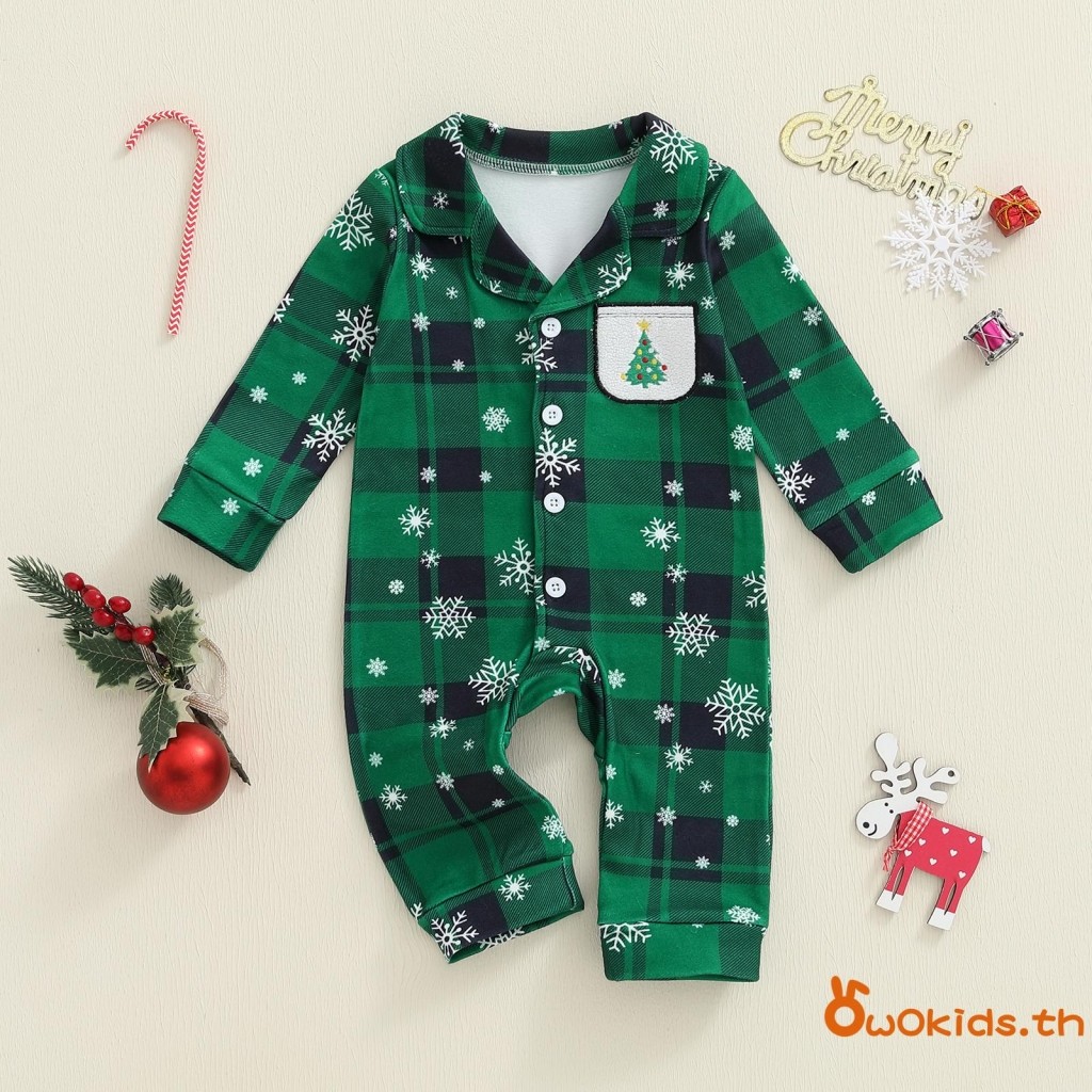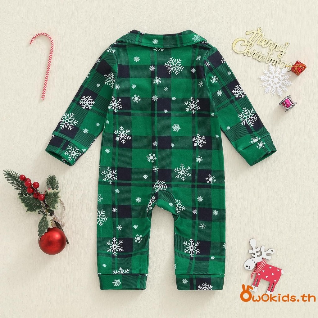 ชุดนอนเด็กคริสต์มาส แบบสก๊อตกับเกล็ดหิมะ ออกแบบคอวีแขนยาว