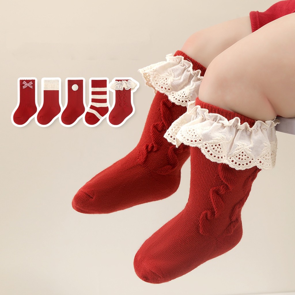 ถุงเท้าเด็ก ดีไซน์ Anti-Slip Dot ทำจากผ้าฝ้าย สไตล์ลายลูกไม้เกาหลีสำหรับวัยหัดเดิน