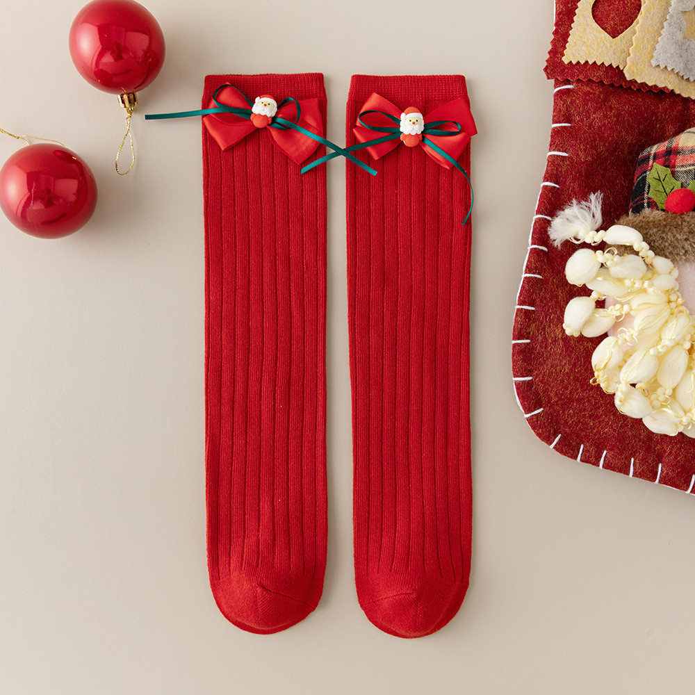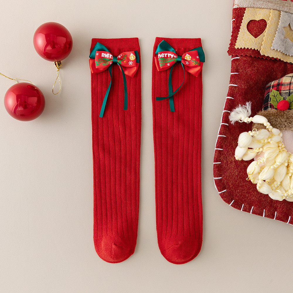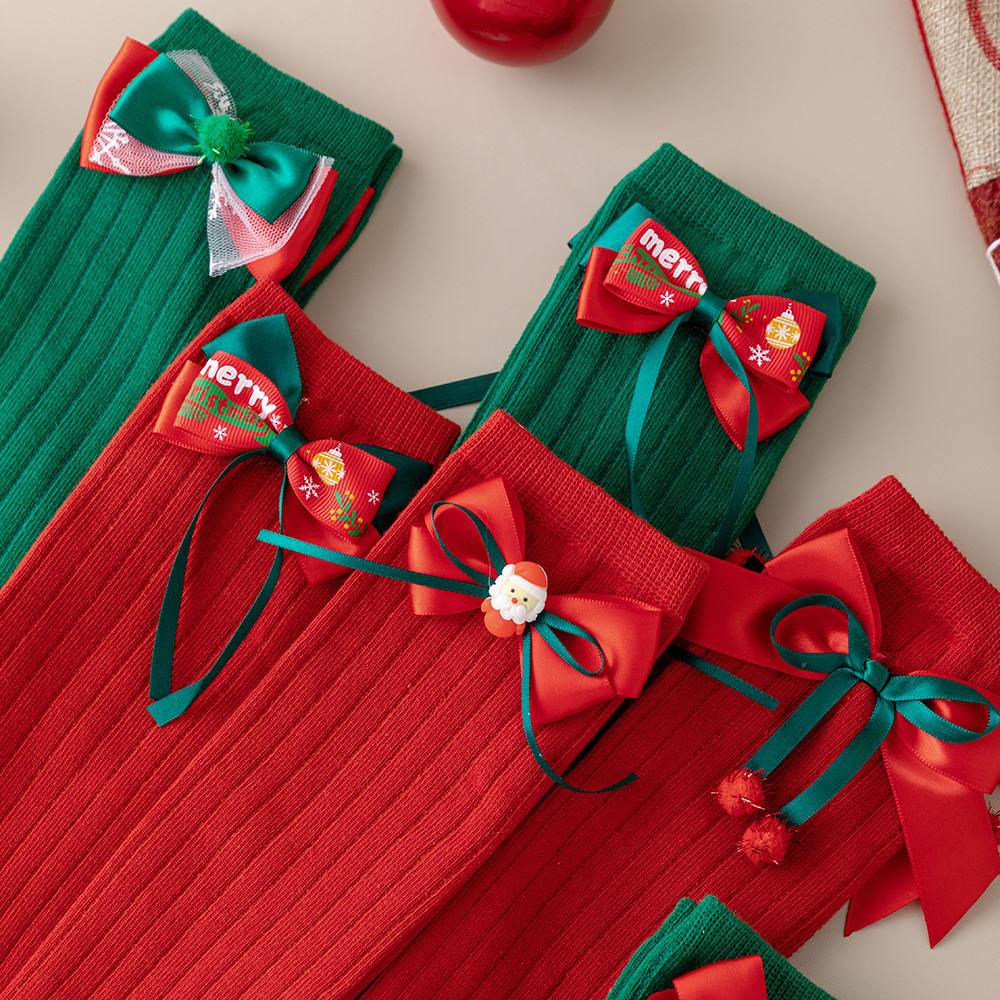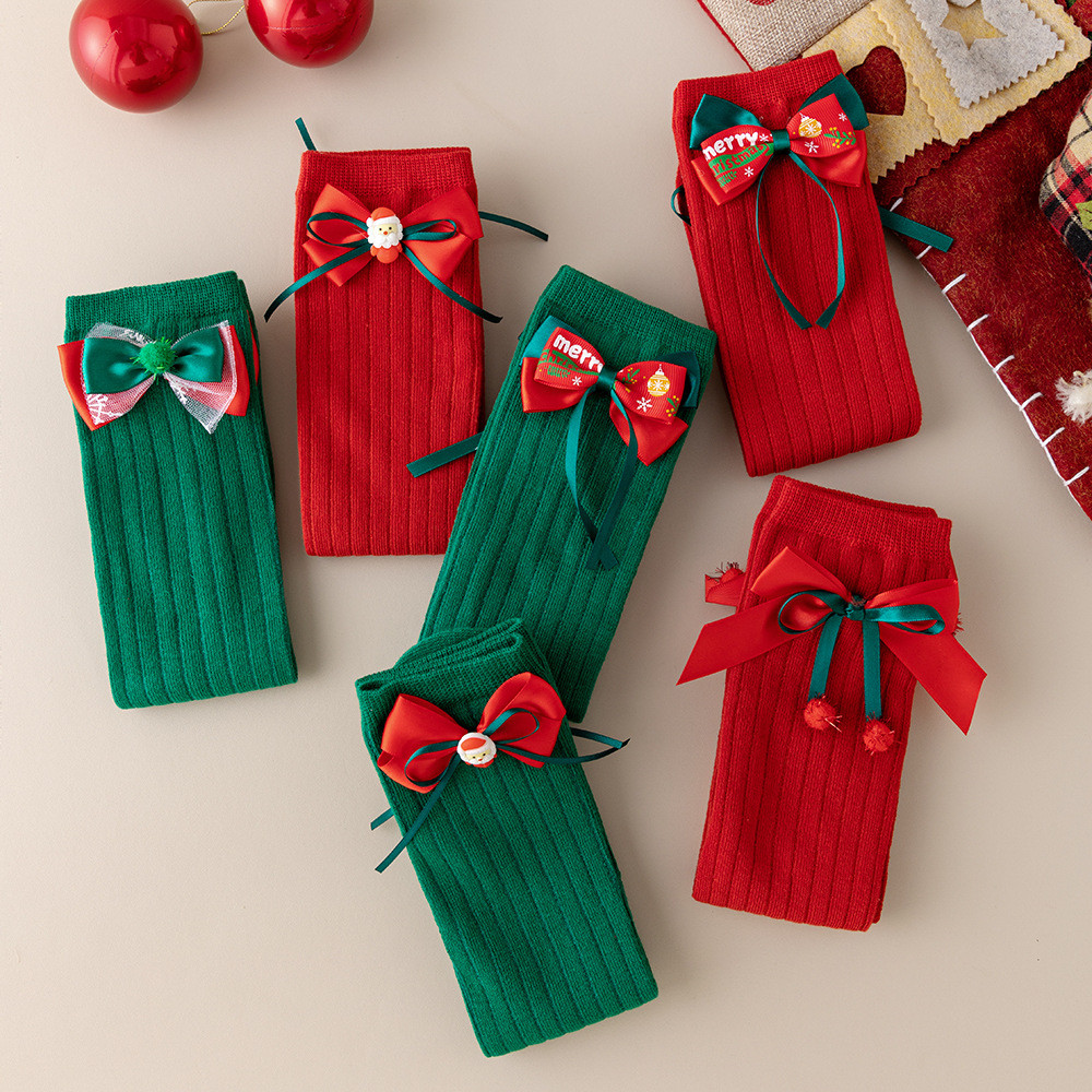 เด็กถุงเท้าฤดูใบไม้ร่วงฤดูหนาวโบว์สีแดงถุงเท้าคริสต์มาส