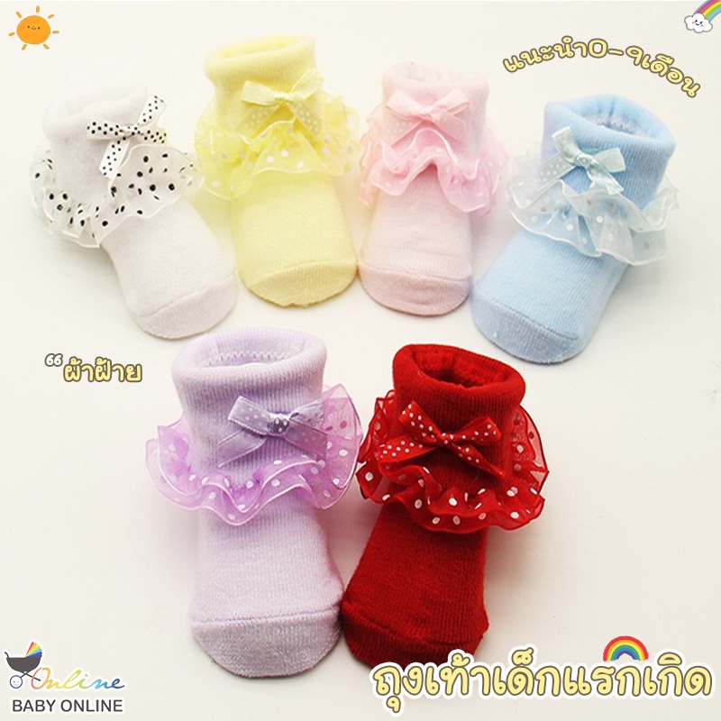 Babyonline(Y059)J3 (ส่งด่วน1วัน) ถุงเท้าผ้าฝ้ายแต่งระบายสีพื้นแบบนุ่มสำหรับเด็กแรกเกิด