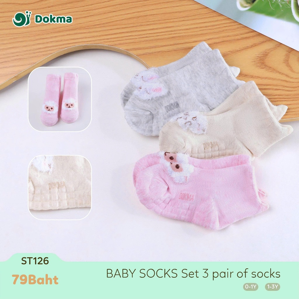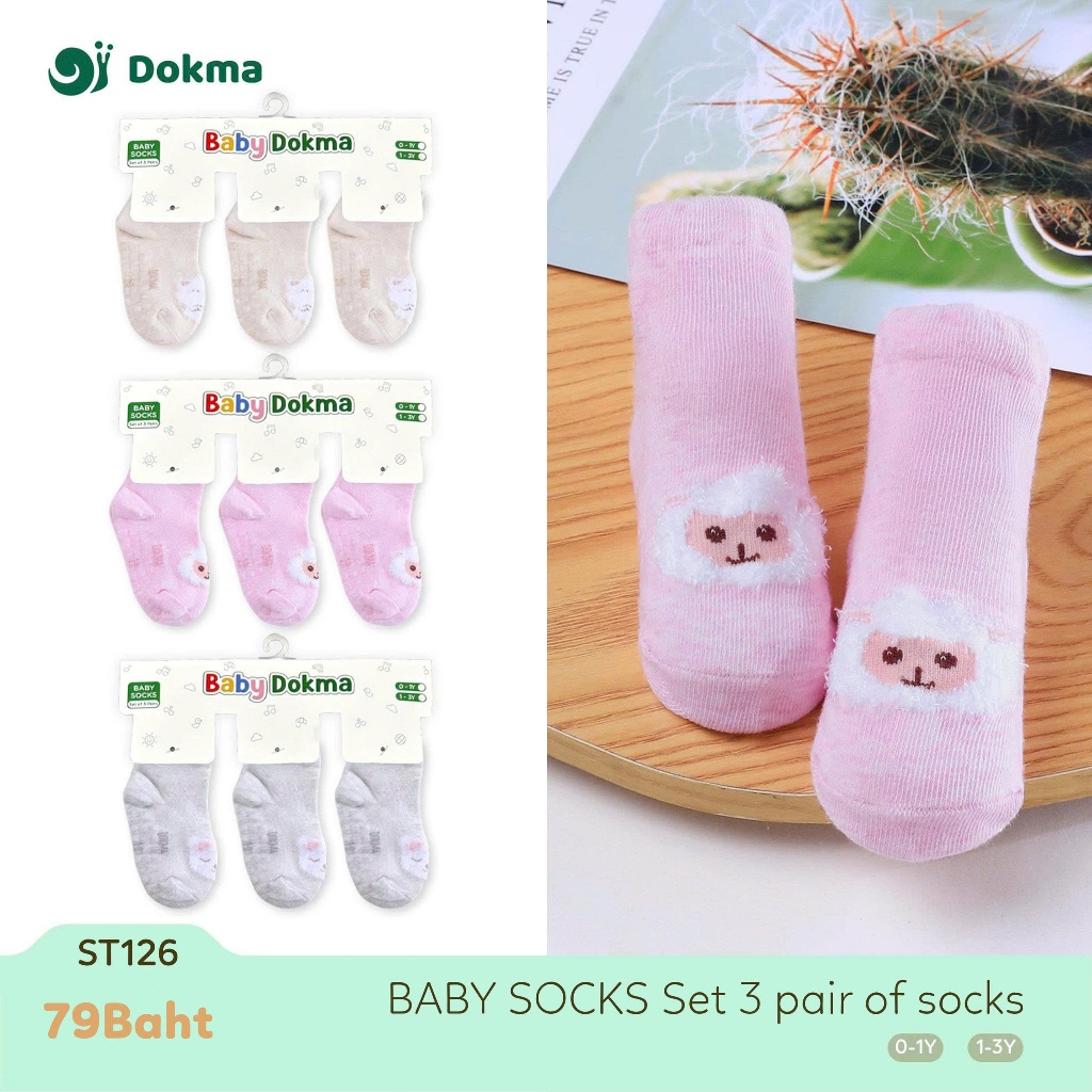 Dokma ถุงเท้าเด็กชาย เด็กหญิง แพ็ก 3 คู่ (3 สี) วัสดุคอตตอนนุ่มระบายอากาศ กันลื่น Baby Socks ST126 (0–1Y / 1–3Y) ST129