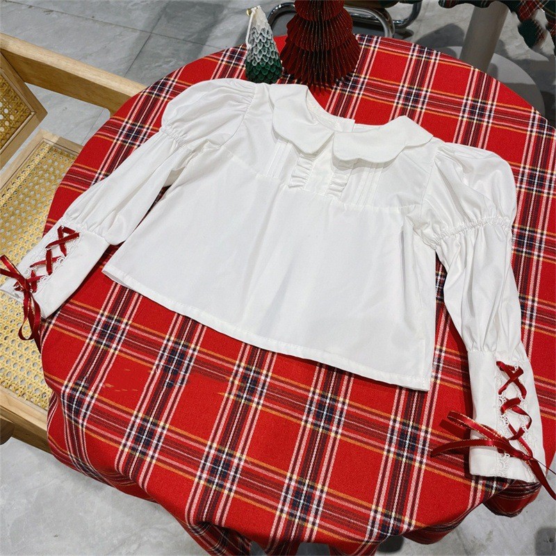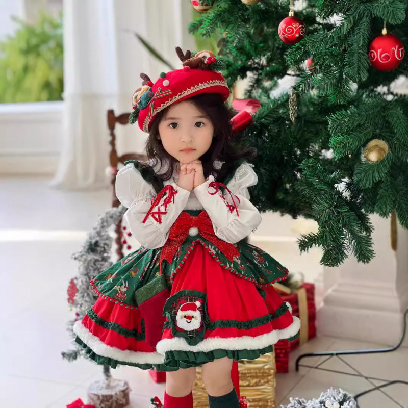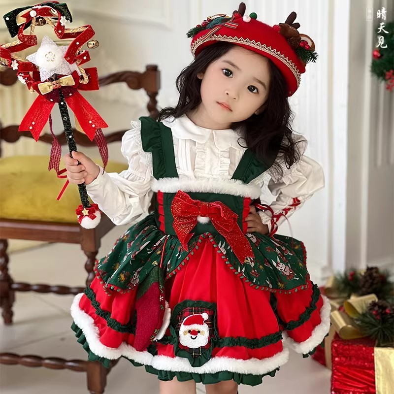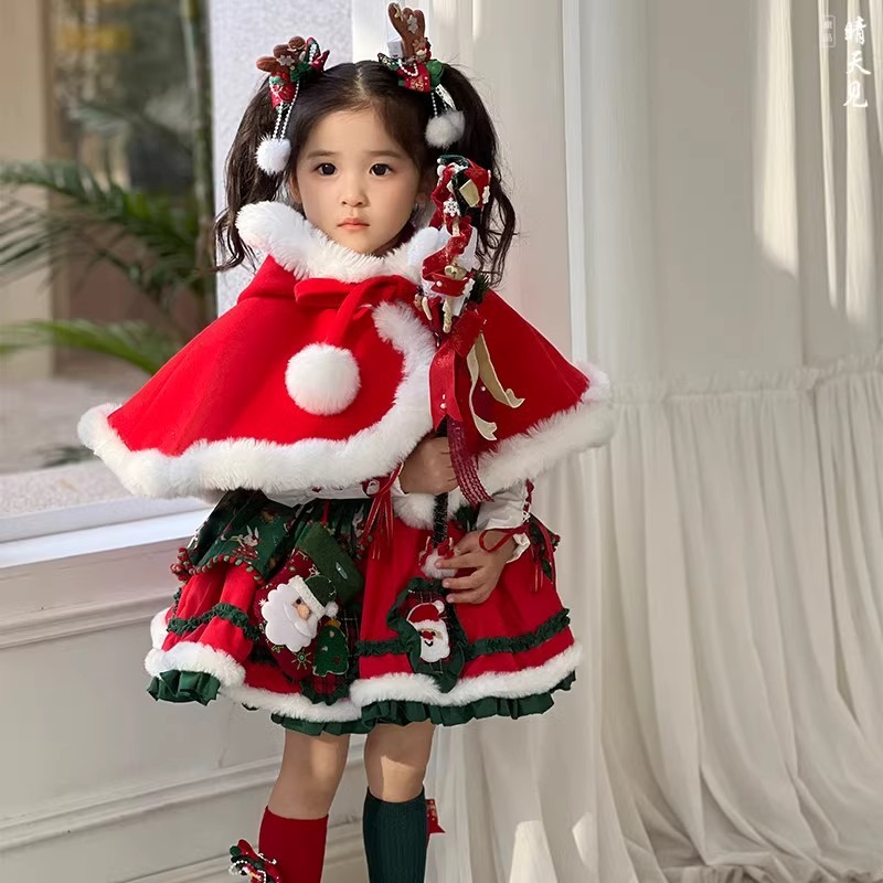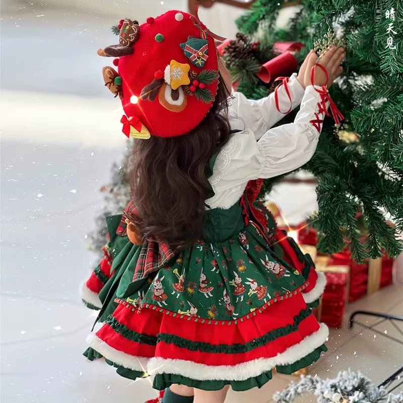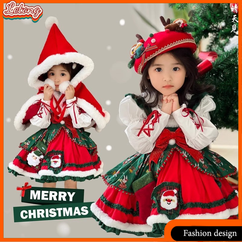 ?LeTong?ชุดเดรสสาวเล็กสไตล์โลลิต้าเสื้อแต่งตัวมีลายแกรนด์จิราฟ พร้อมทับเสื้อสีแดง วันคริสต์มาส