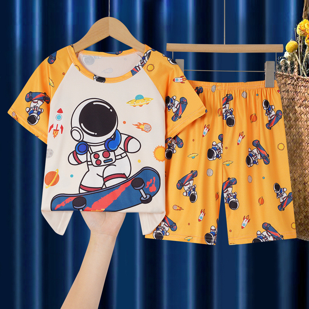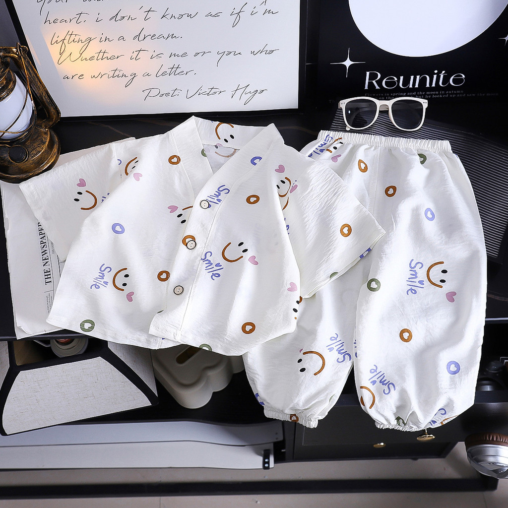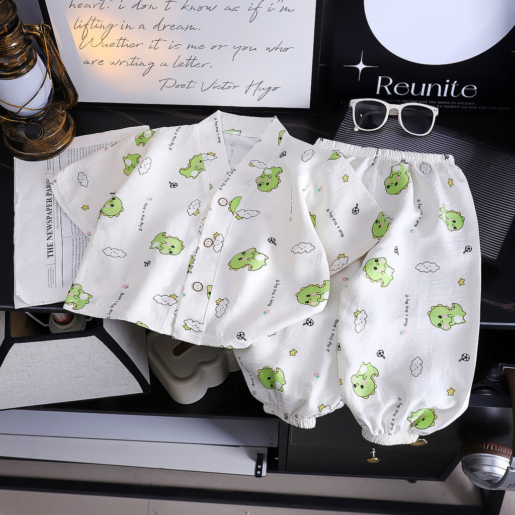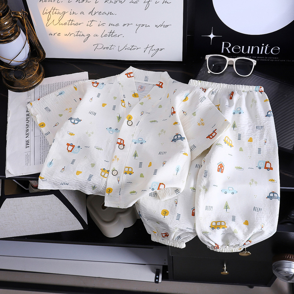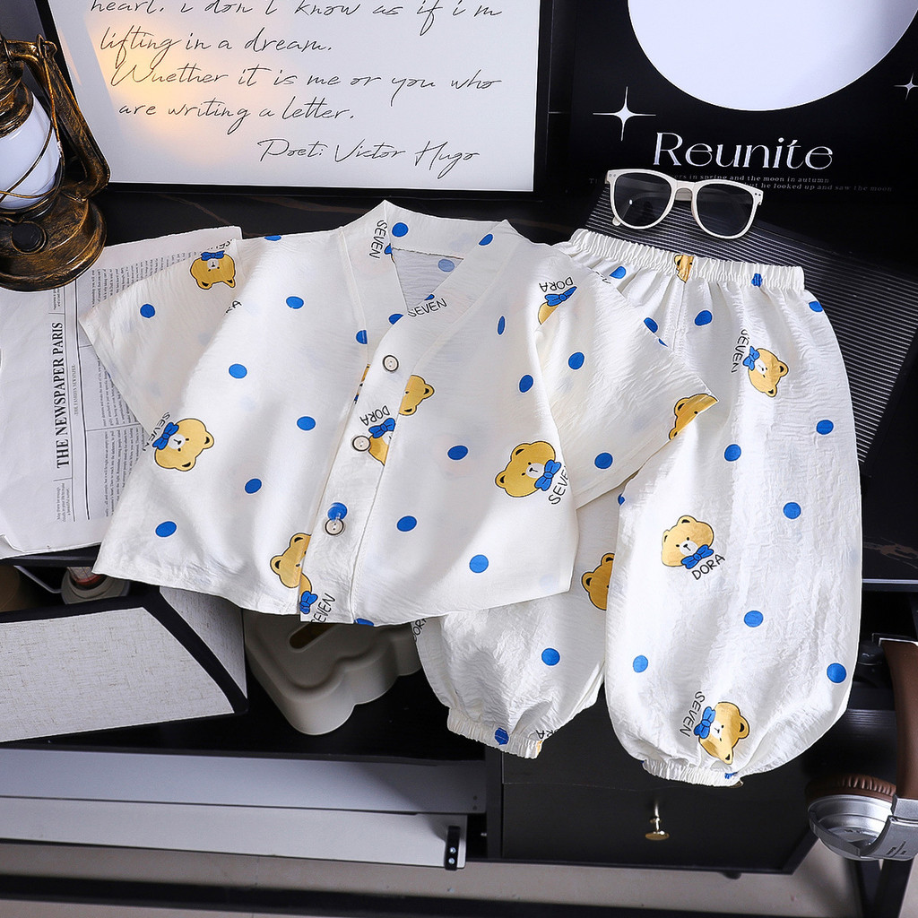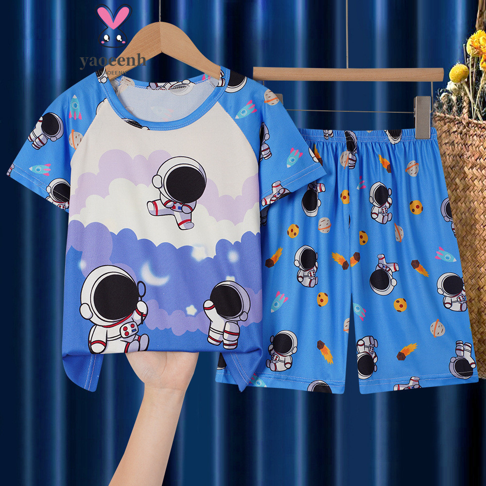 【YAOEENH】80-150เซนติเมตรฤดูร้อนชายหญิงคอวีเมฆผ้าฝ้ายชุดนอนกลางเด็กเล็กการ์ตูนสามทหารแขน ชุดบ้าน ชุดพร้อมสต็อกจัดส่งที่รวดเร็ว
