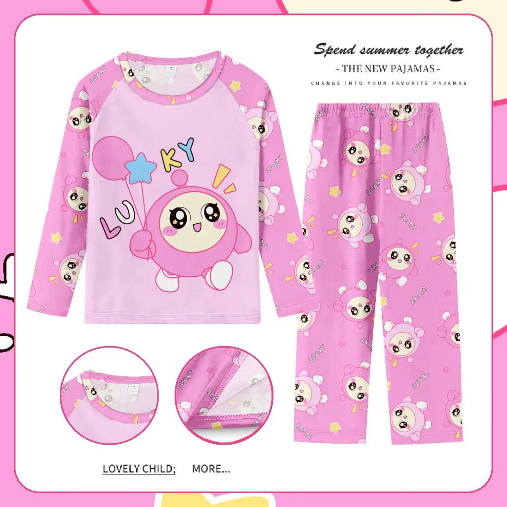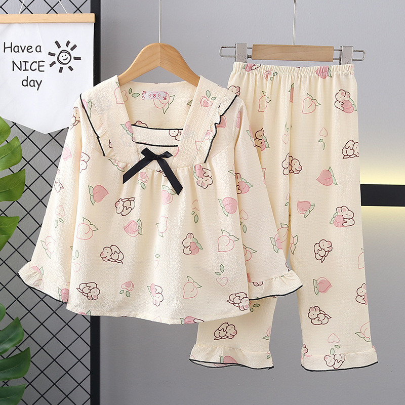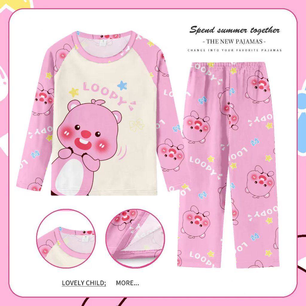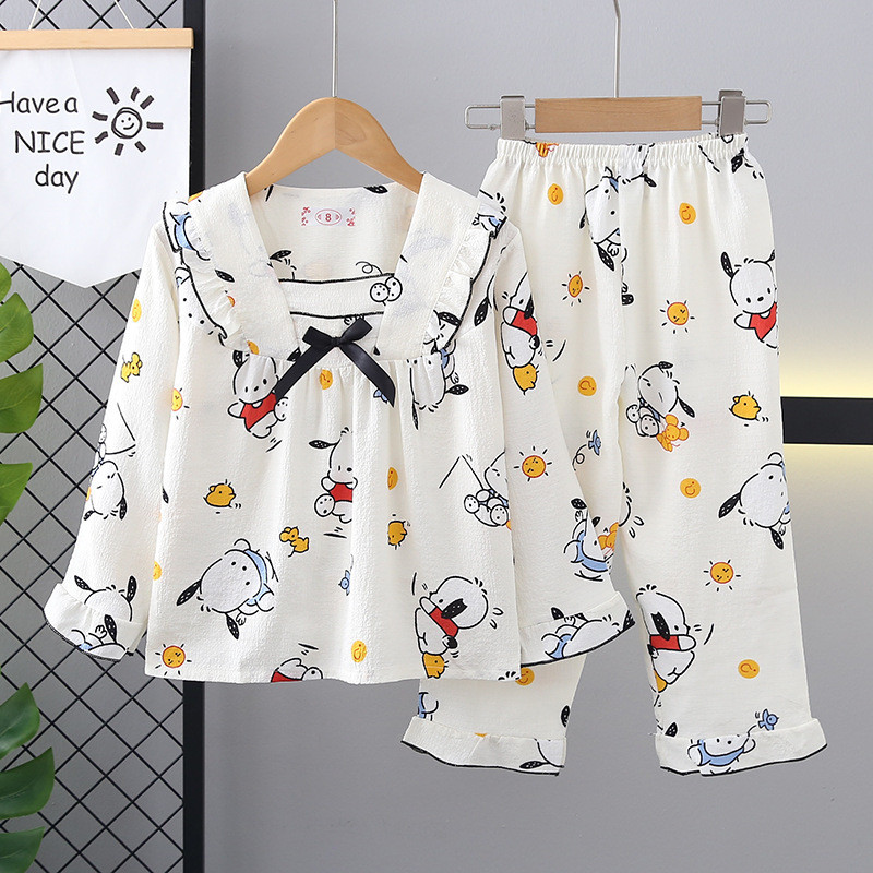 คลังสินค้าพร้อม 105-150 ซม. ฤดูใบไม้ผลิฤดูใบไม้ร่วงสาวบางแขนยาวชุดนอนชุดกลางเด็กใหญ่การ์ตูน Ruffled Princess Homewear