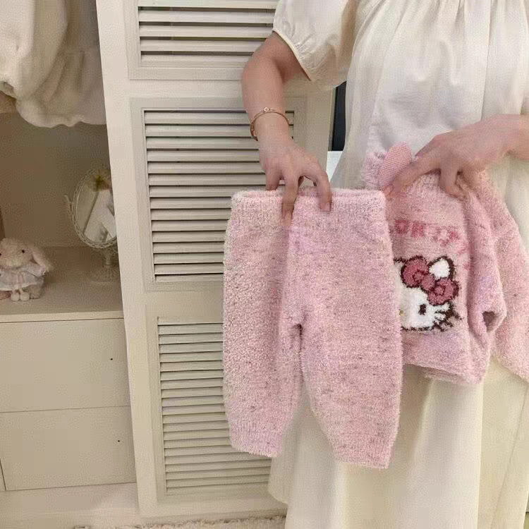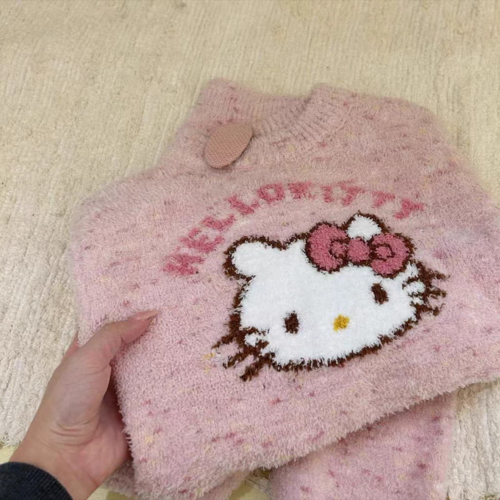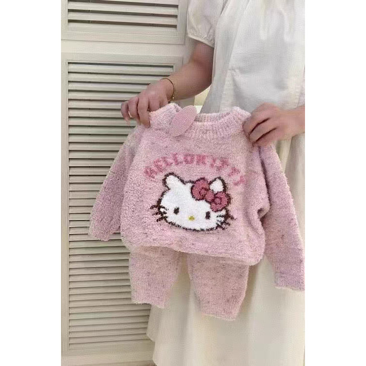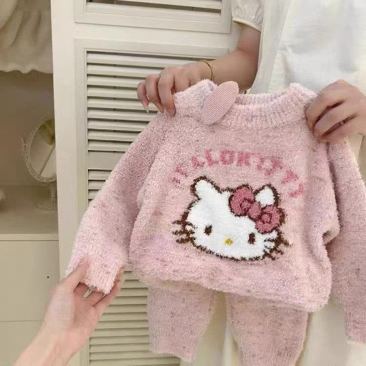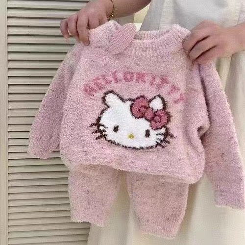 ชุดนอนกันหนาวสำหรับเด็กรุ่นใหม่ฤดูใบไม้ร่วงและฤดูหนาวเสื้อกำมะหยี่แมวคิตตี้น่ารักสำหรับเด็กผู้หญิงชุดบริการที่บ้านเพิ่มความหนา