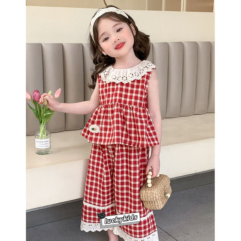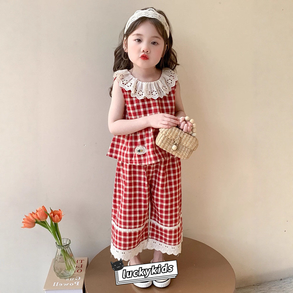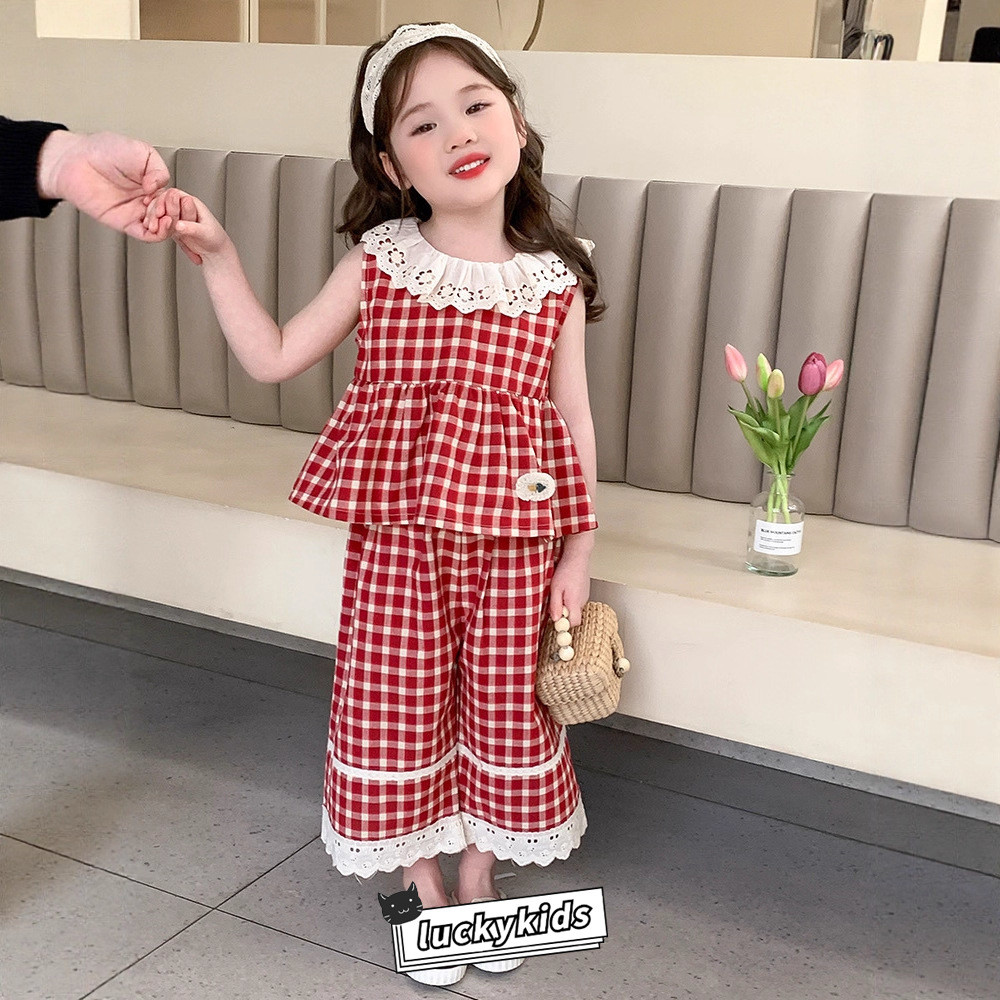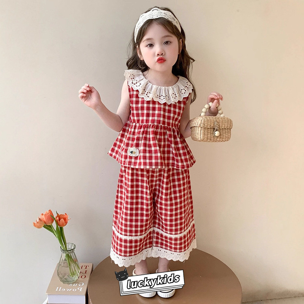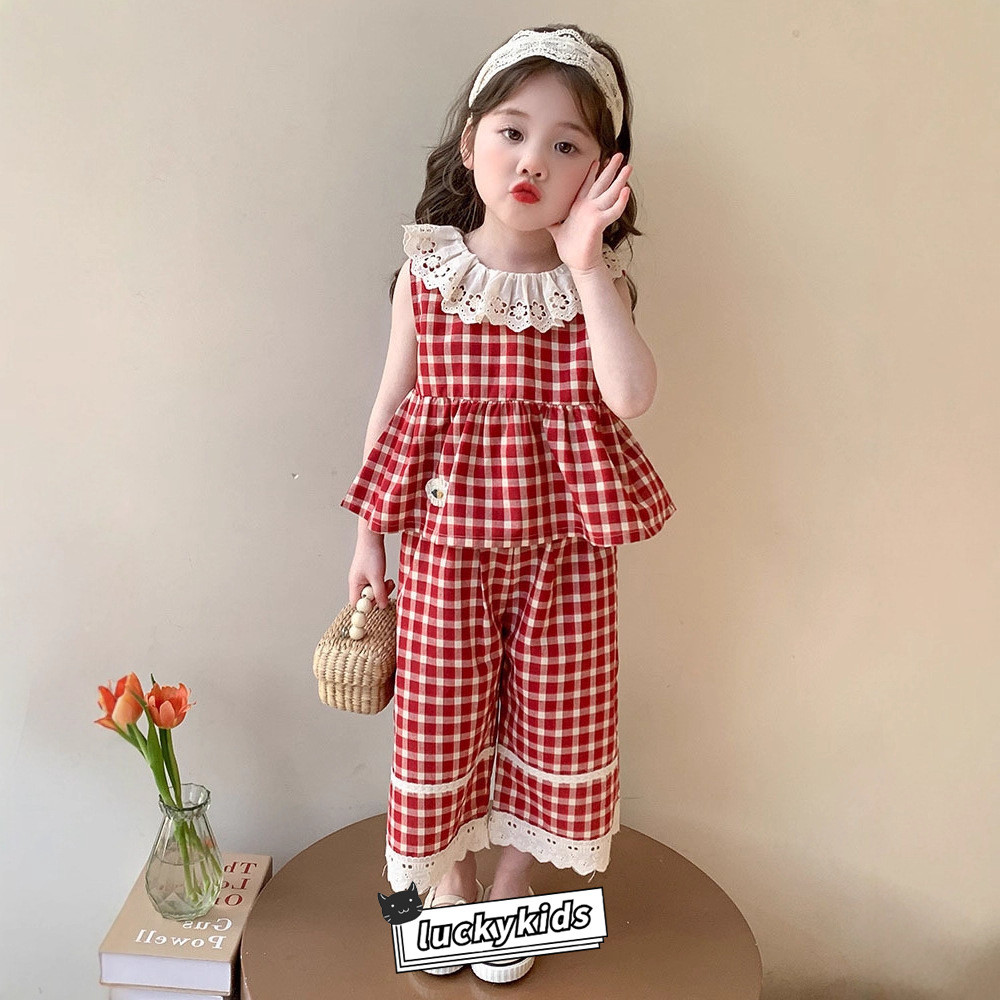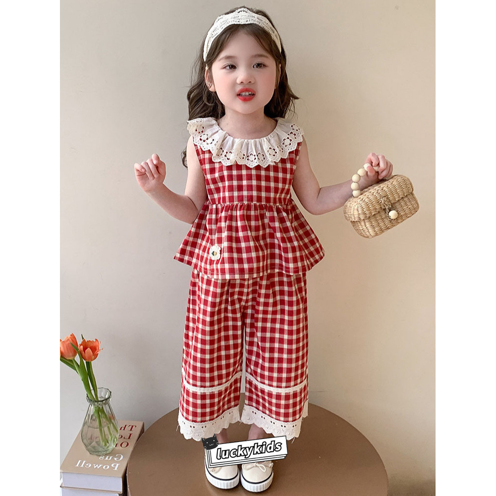 ชุดสูทฤดูร้อนสำหรับเด็กสาว ลายสก๊อต พิมพ์ลูกไม้ รวมชุด 2 ชิ้น: ท็อปส์แขนกุดและกางเกงขาบาน