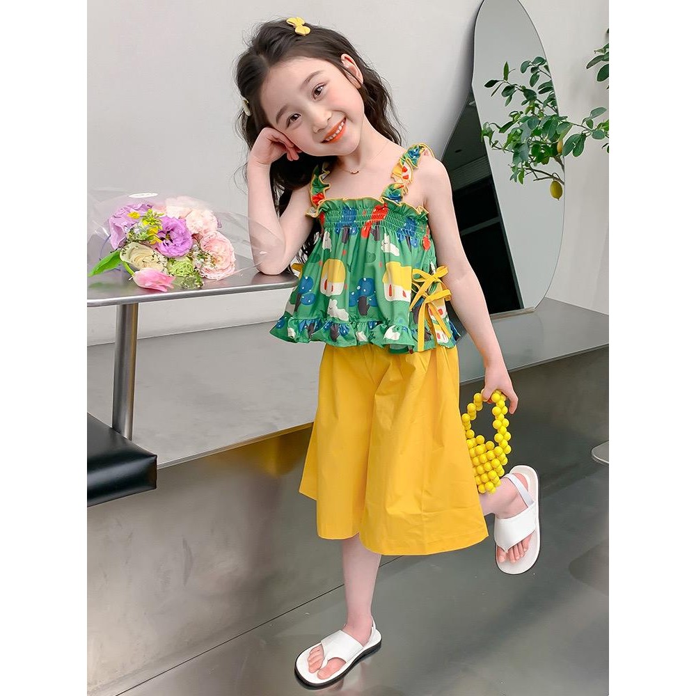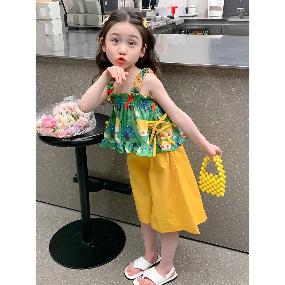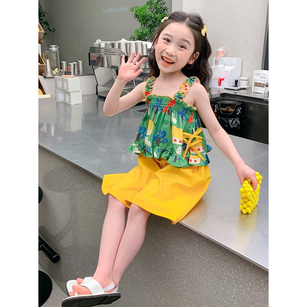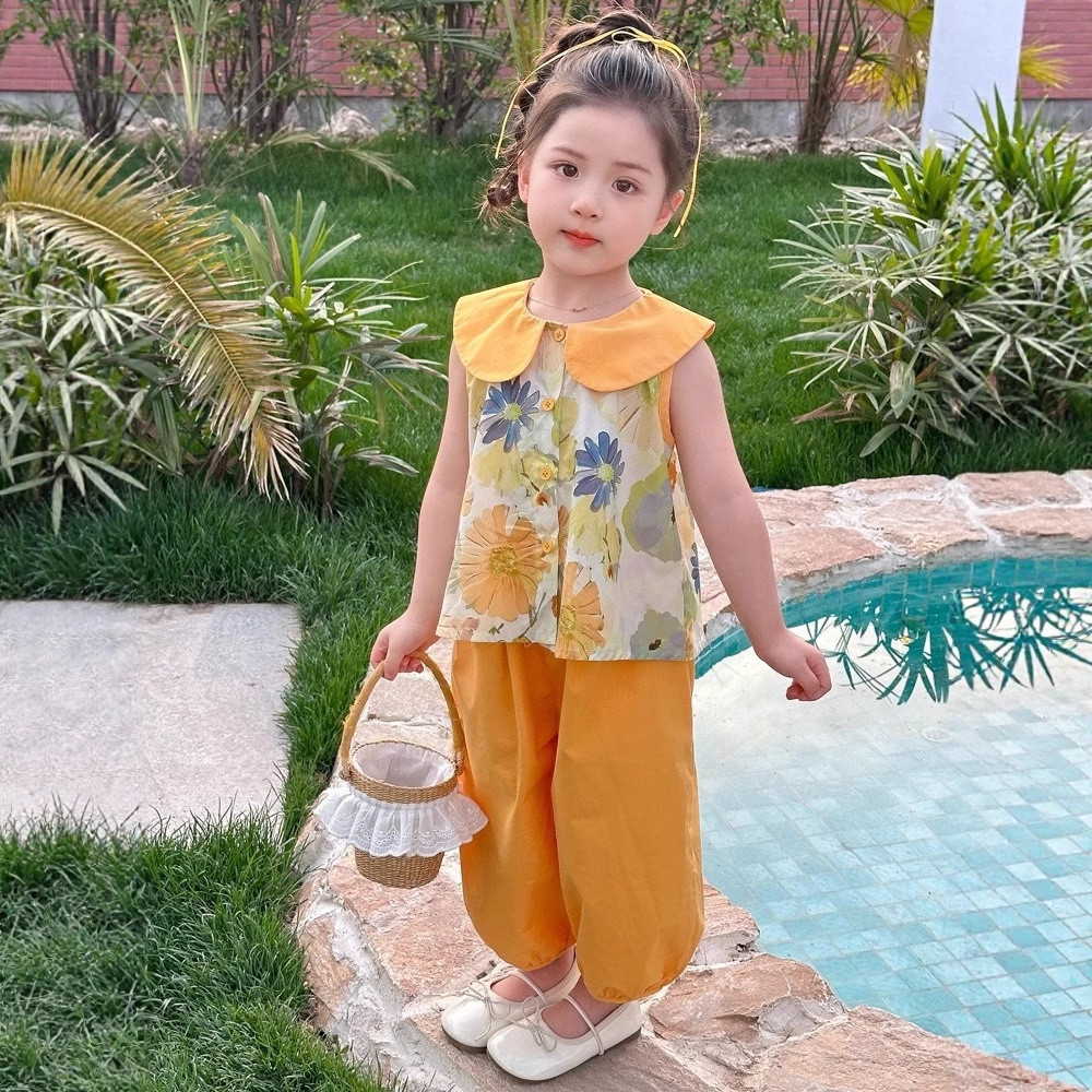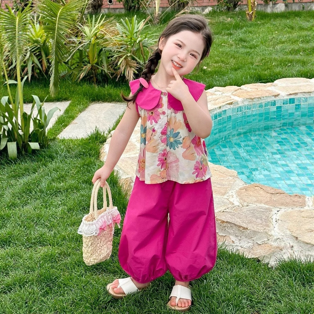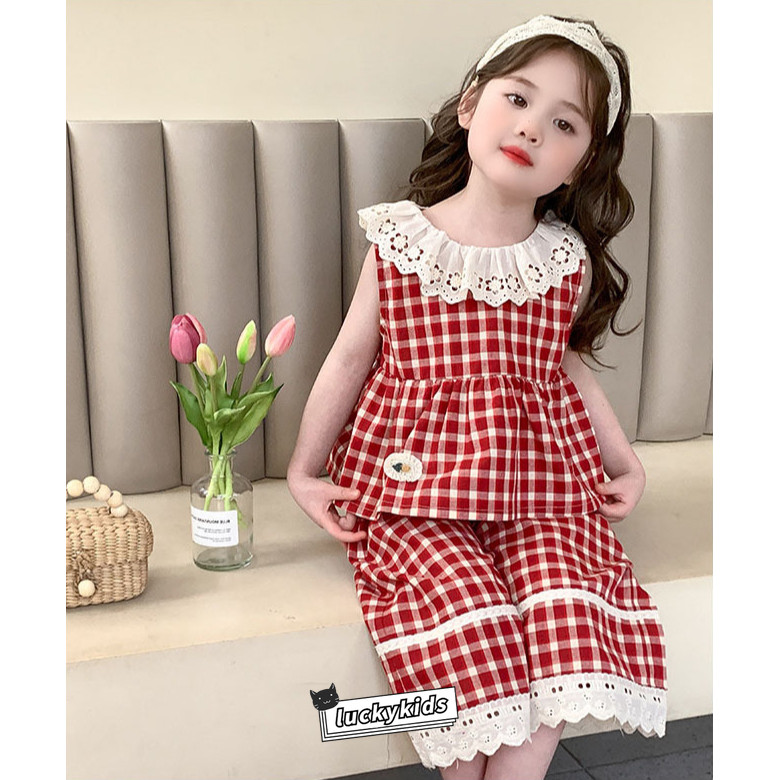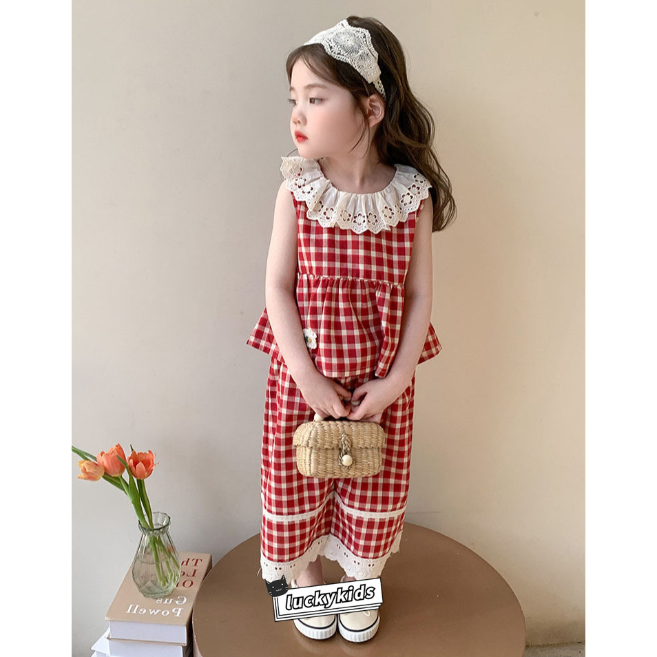 ชุดสูทฤดูร้อนสำหรับเด็กสาว ลายสก๊อต พิมพ์ลูกไม้ รวมชุด 2 ชิ้น: ท็อปส์แขนกุดและกางเกงขาบาน