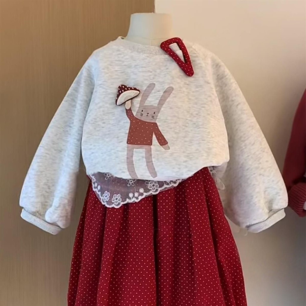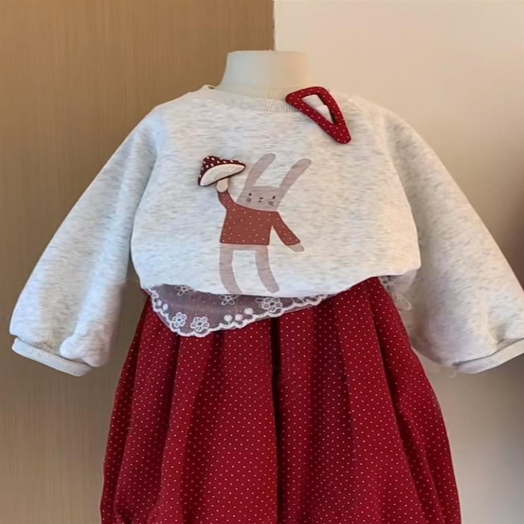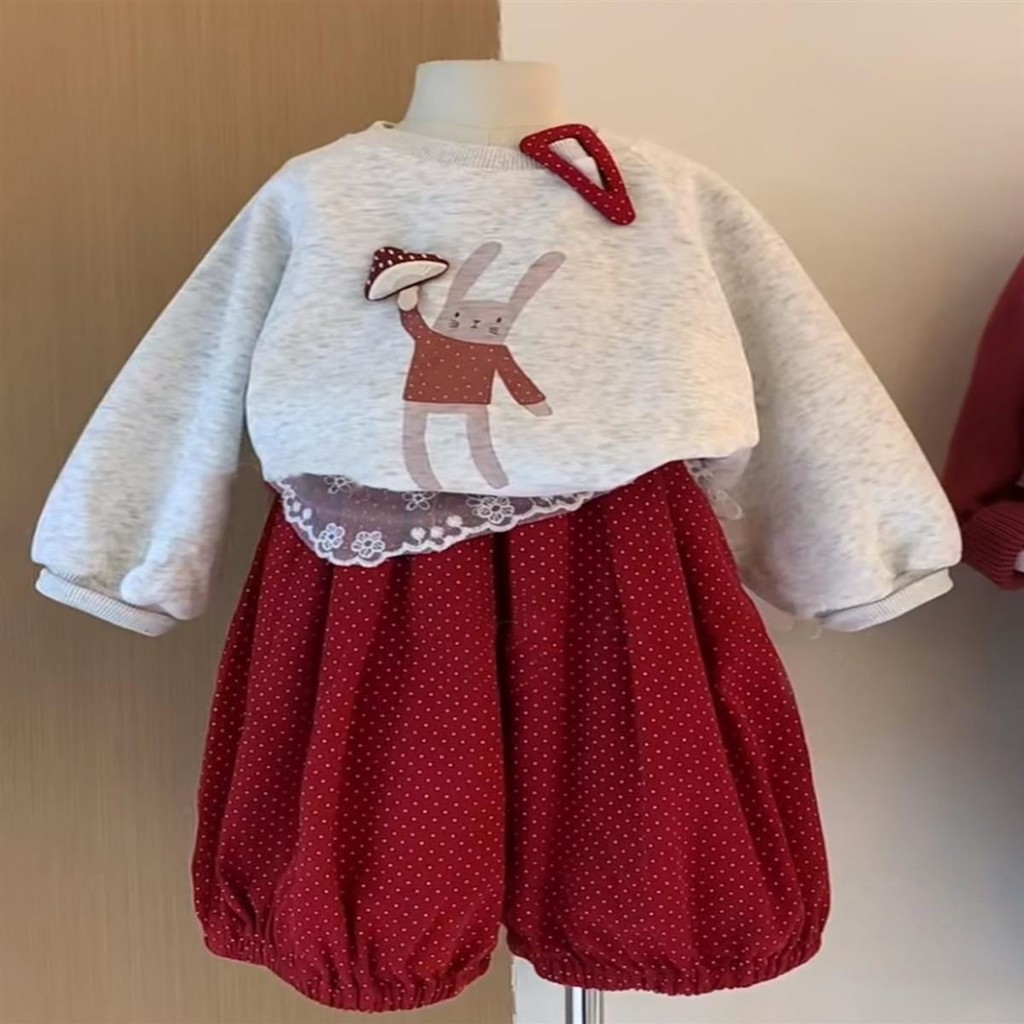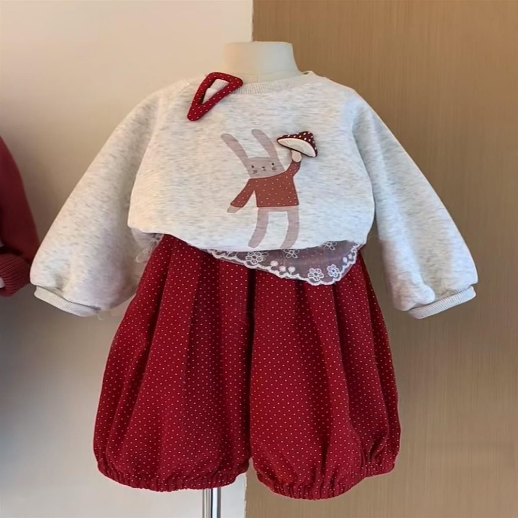 ชุดสูทเด็กผู้หญิง เสื้อสเวตเตอร์ลายการ์ตูนและกางเกงขากว้างสีแดง ชุดสองชิ้น