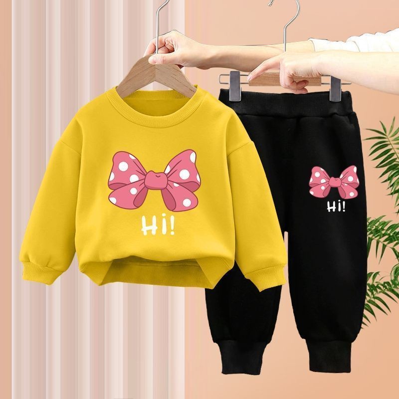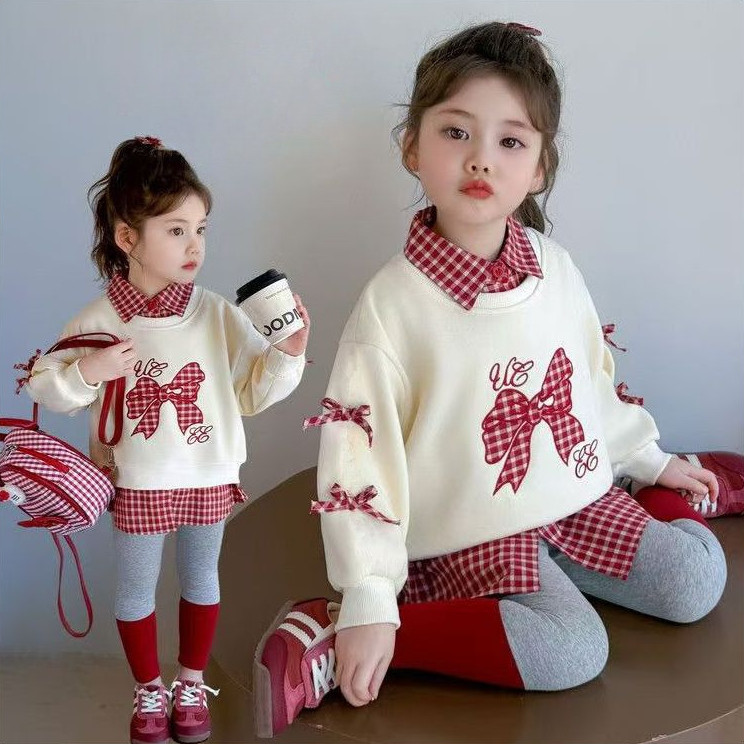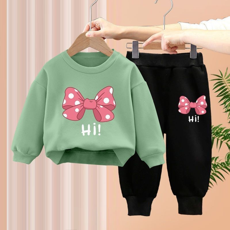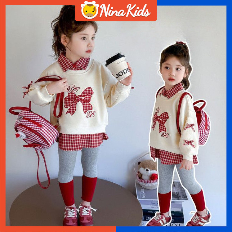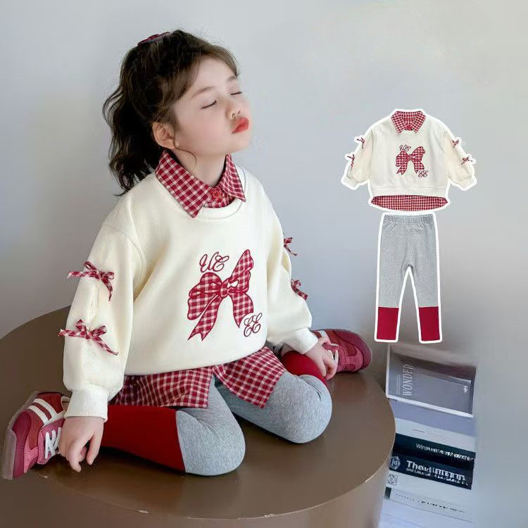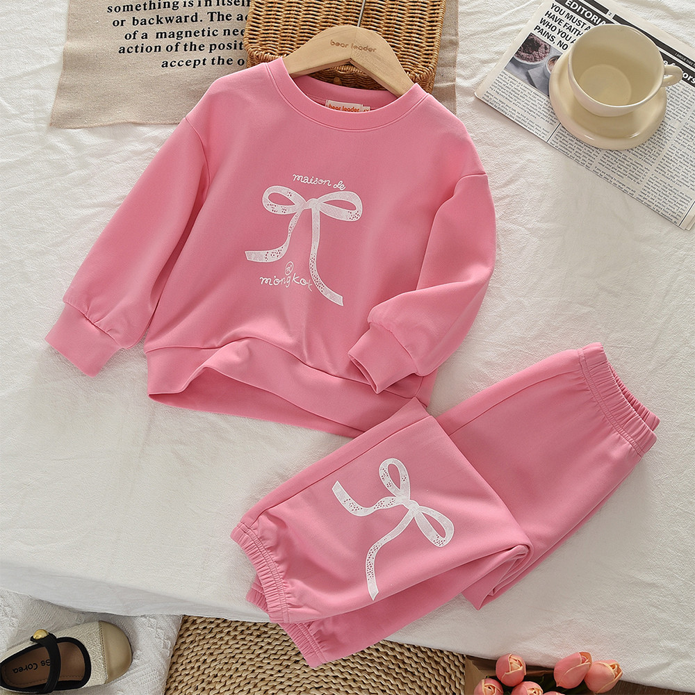 ชุดสองชิ้นสำหรับทารกหญิง ออกแบบมาพร้อมโบว์ด้านบนและเลกกิ้ง สไตล์เกาหลีสำหรับเด็กอายุ 1-7 ปี