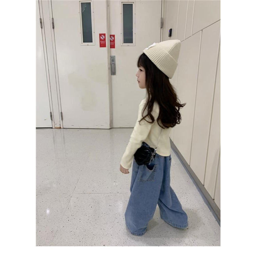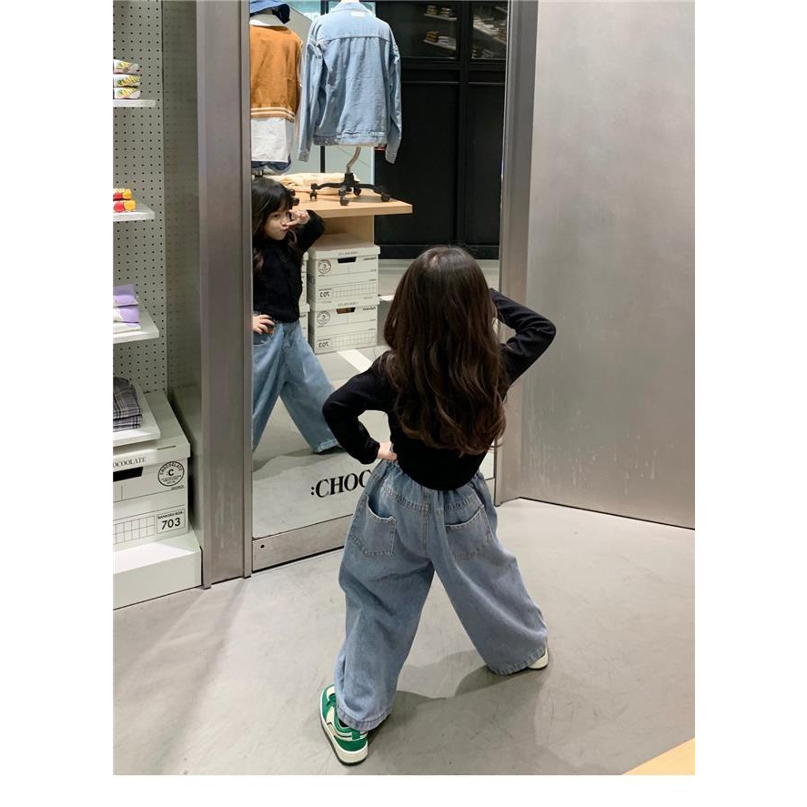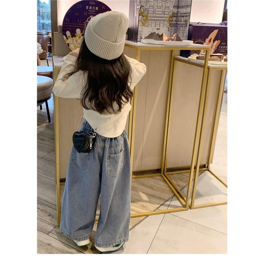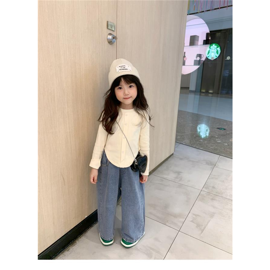 ชุดเสื้อเชิ้ต ผ้าฝ้ายแท้ และกางเกงยีนขากว้าง แฟชั่นฤดูใบไม้ผลิ และฤดูใบไม้ร่วง สไตล์เกาหลี สําหรับเด็กผู้หญิง