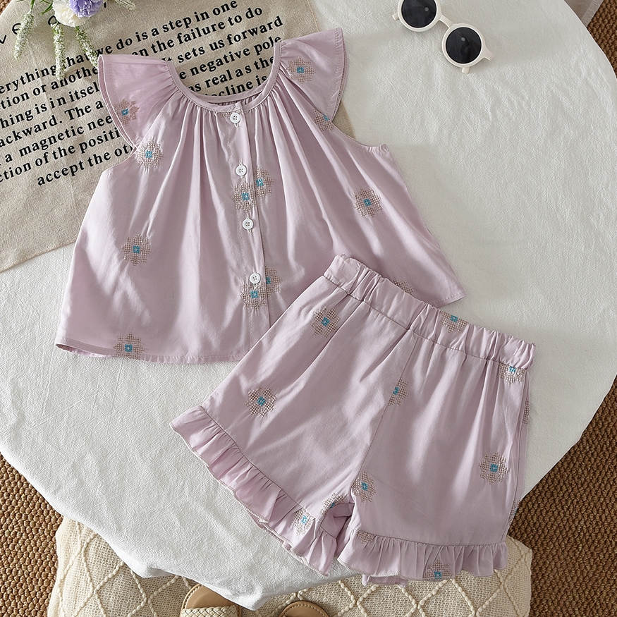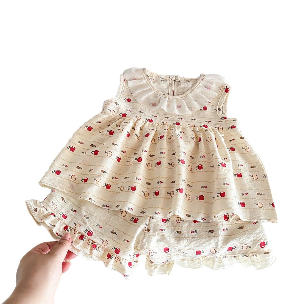 ชุดเสื้อผ้าเด็กสองชิ้นแขนกุดลายดอกไม้น่ารักสไตล์เจ้าหญิง