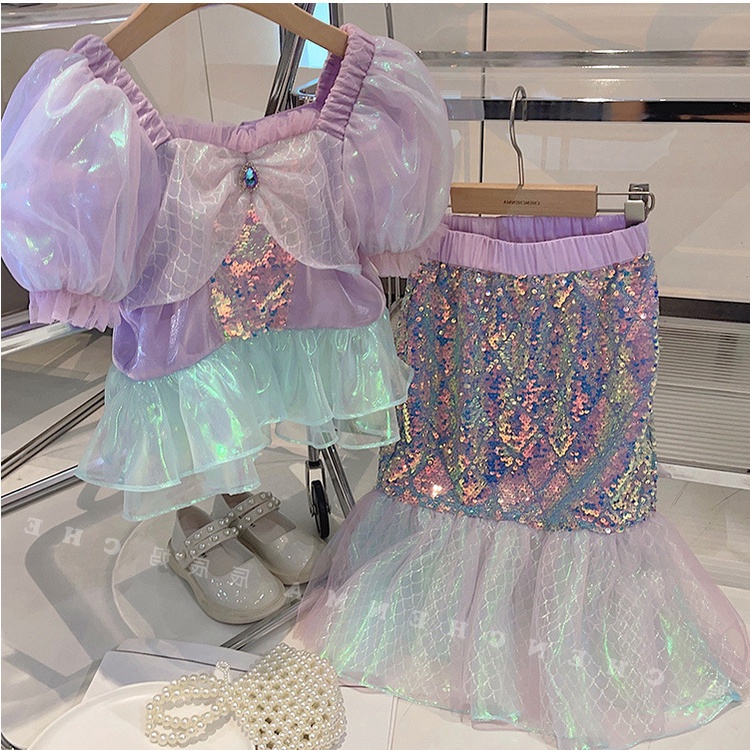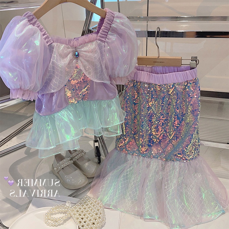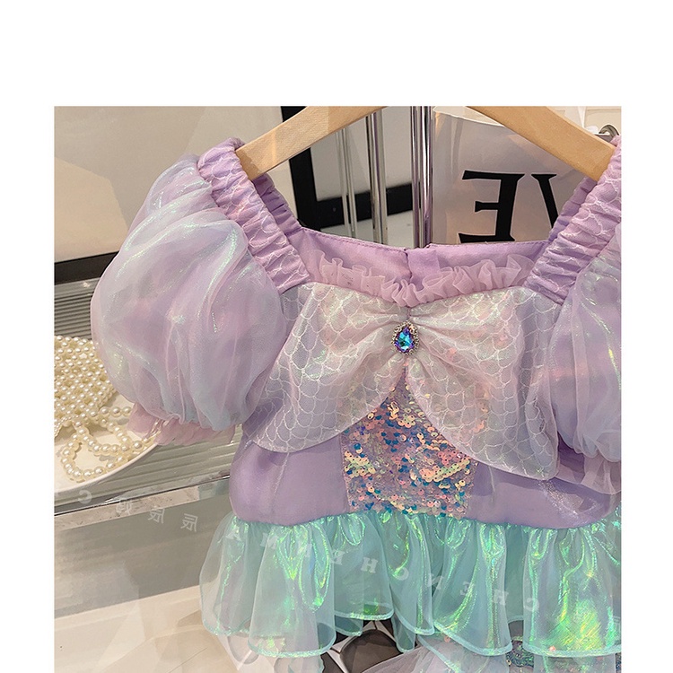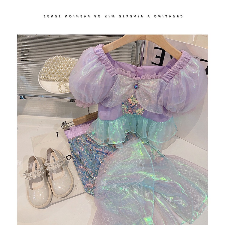 ชุดเดรสนางเงือก แขนพัฟ แขนห้าส่วน ปักเลื่อม แฟชั่นฤดูร้อน สําหรับเด็กผู้หญิง