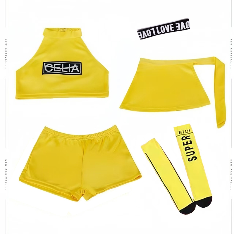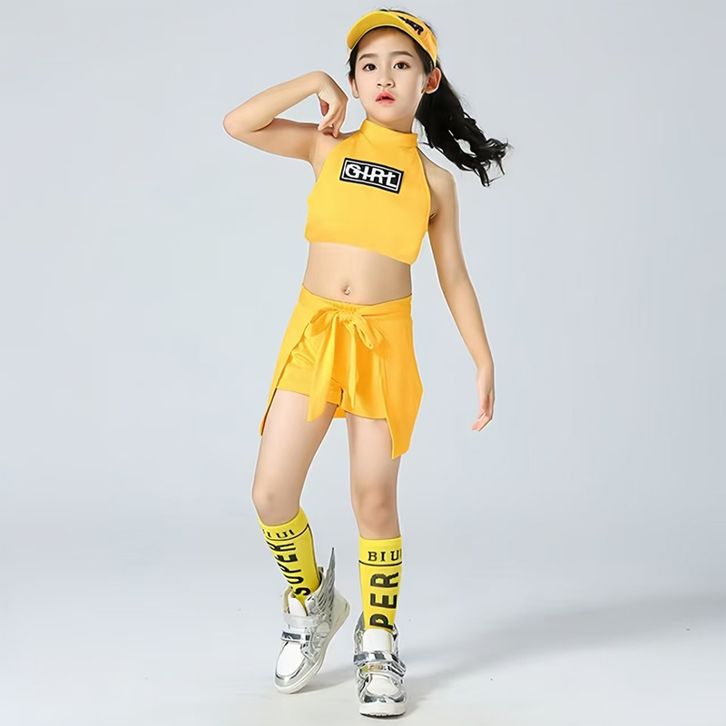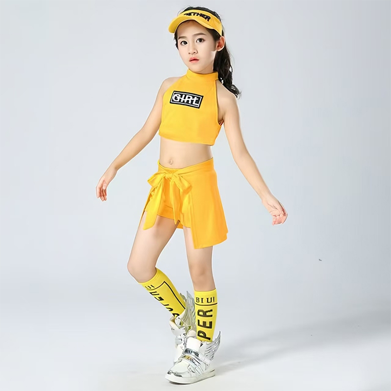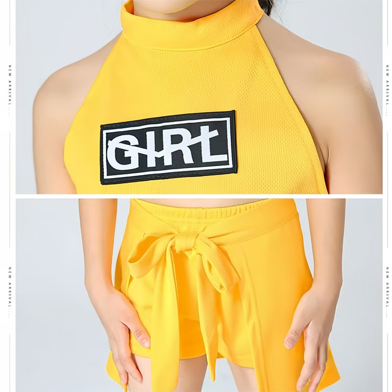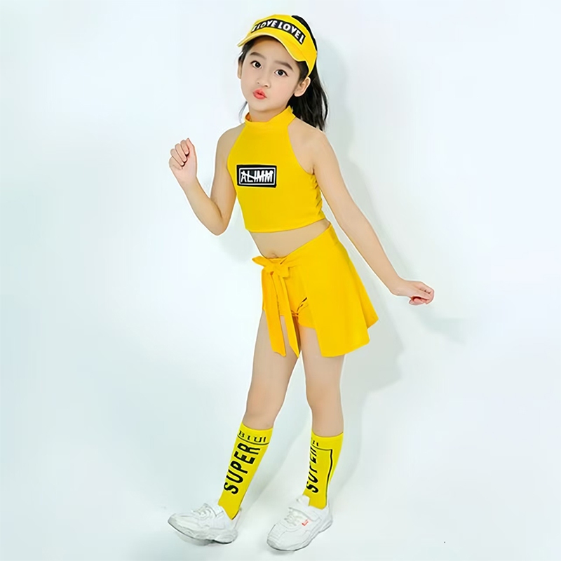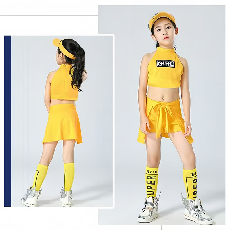 ชุดเต้นแอโรบิคเด็ก พร้อมส่งในไทย ชุดเต้นเชียร์ลีดเดอร์สีเหลือง ชุดเซ็ต มีถุงเท้าสีเหลืองเข้าเซ็ต กางเกงกระโปรง ชุดเต้น