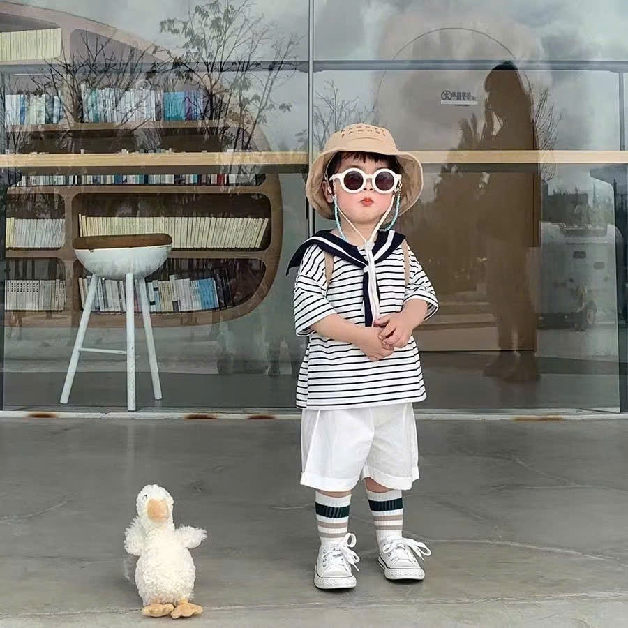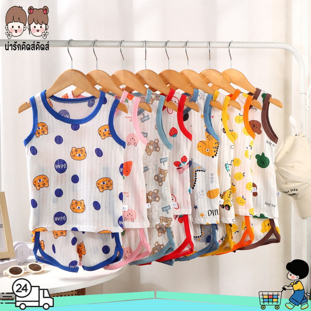 ชุดเสื้อกล้ามเด็ก เสื้อกล้ามและกางเกงขาสั้น พิมพ์ลาย ผ้าฝ้าย ใส่สบาย ขอบสีๆ สำหรับเด็กชายและเด็กหญิง