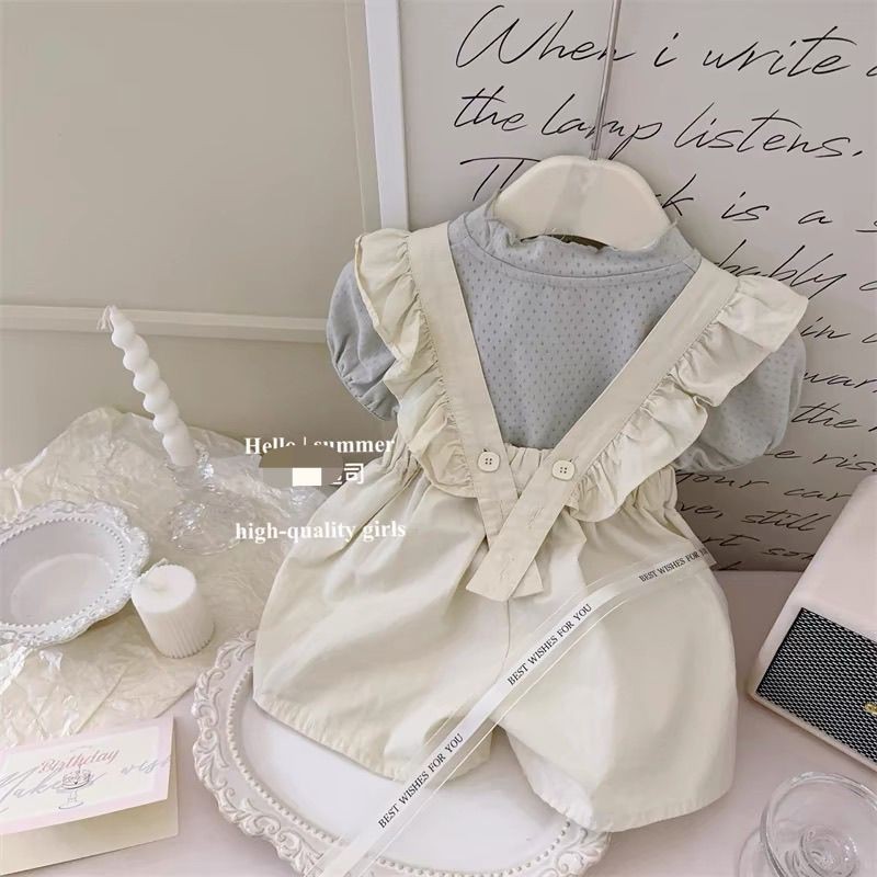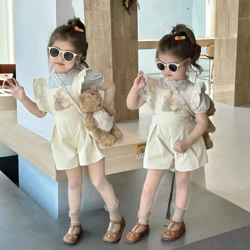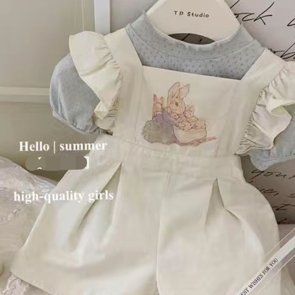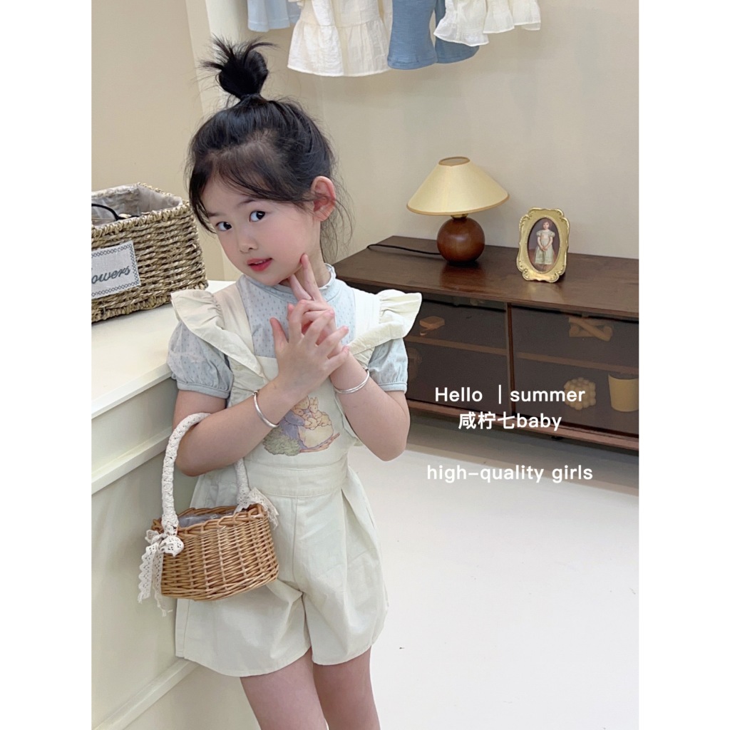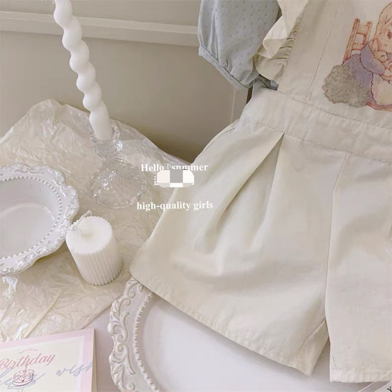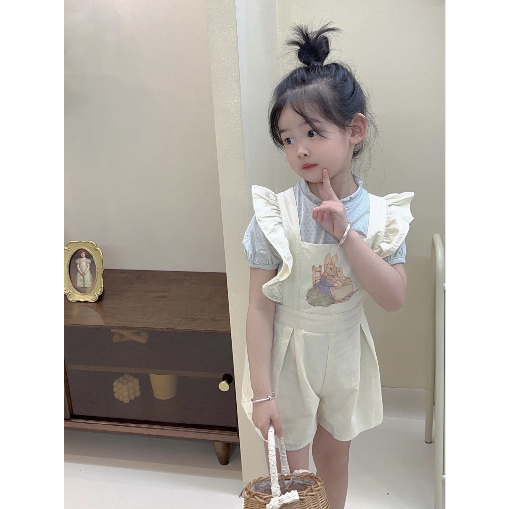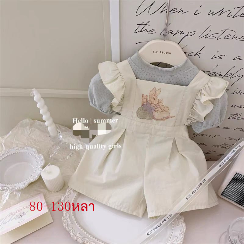 [Aria]?2025กางเกงเอี๊ยมกระต่ายเด็กผู้หญิงรุ่นใหม่ชุดจั๊มสูทเด็กผู้หญิงฤดูร้อนผ้าไหมน้ำแข็งตาข่ายเสื้อยืดสองชิ้น