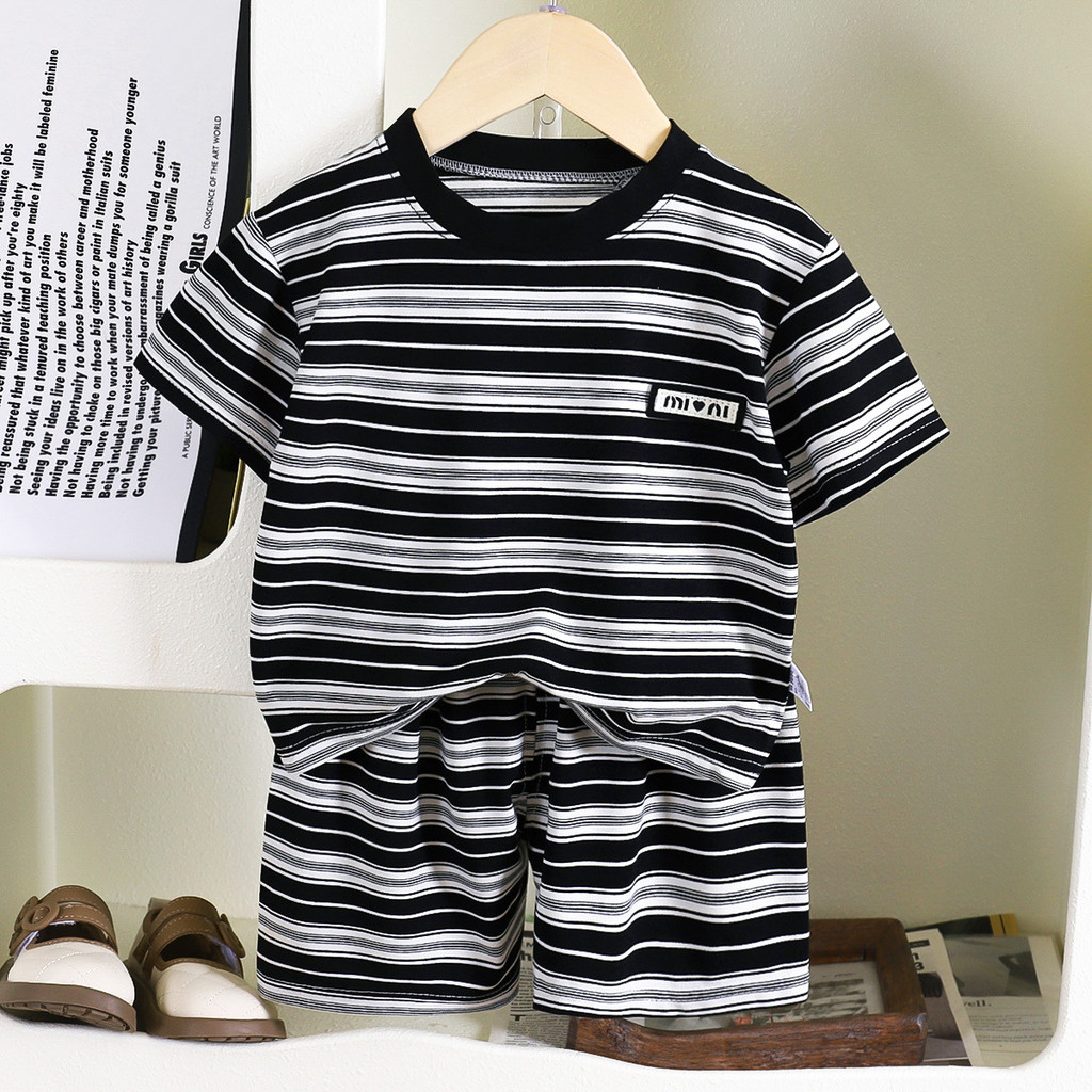 [RJ] 80-140ซม ชุดสูทแขนสั้นสําหรับเด็กฤดูร้อนสไตล์ใหม่เด็กผู้ชายลายกางเกงขาสั้นเด็กทารกระบายอากาศสองชิ้นเสื้อผ้าฤดูร้อนเด