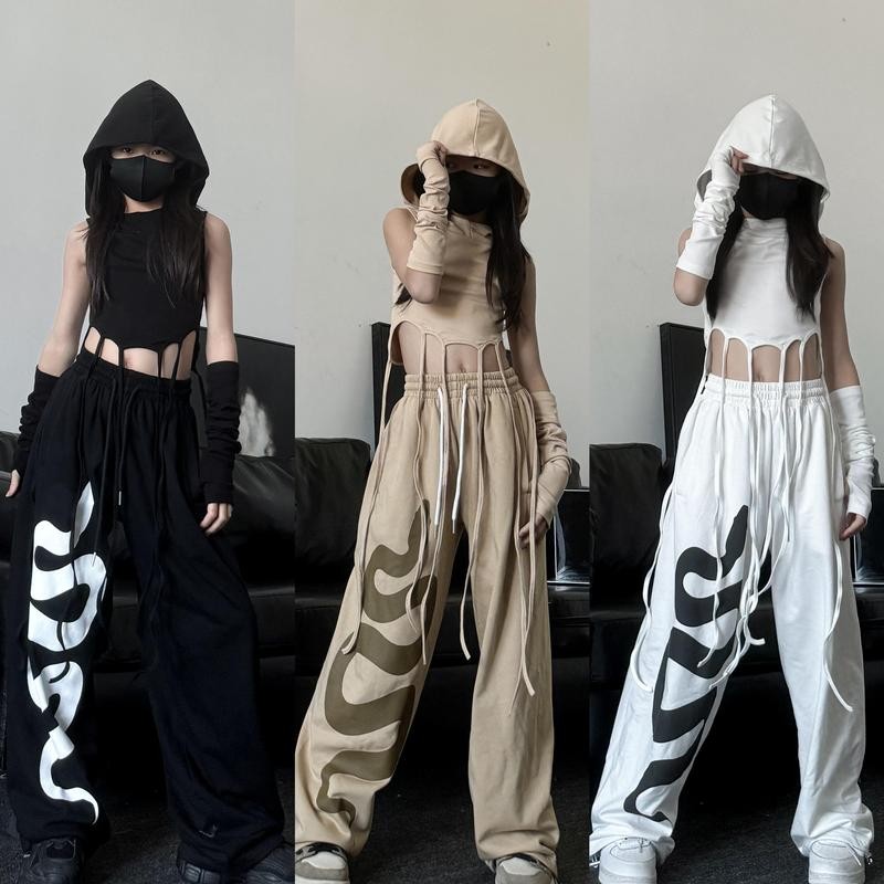 [KeDaYa] พร้อมส่ง เสื้อกั๊กมีฮู้ดแต่งระบาย + ถุงมือครึ่งนิ้ว สไตล์เกาหลี กางเกงวอร์มลายงูหลากสี แฟชั่นฮิปฮอป ชุดเต้น cover เด็กผู้หญิง Y2K