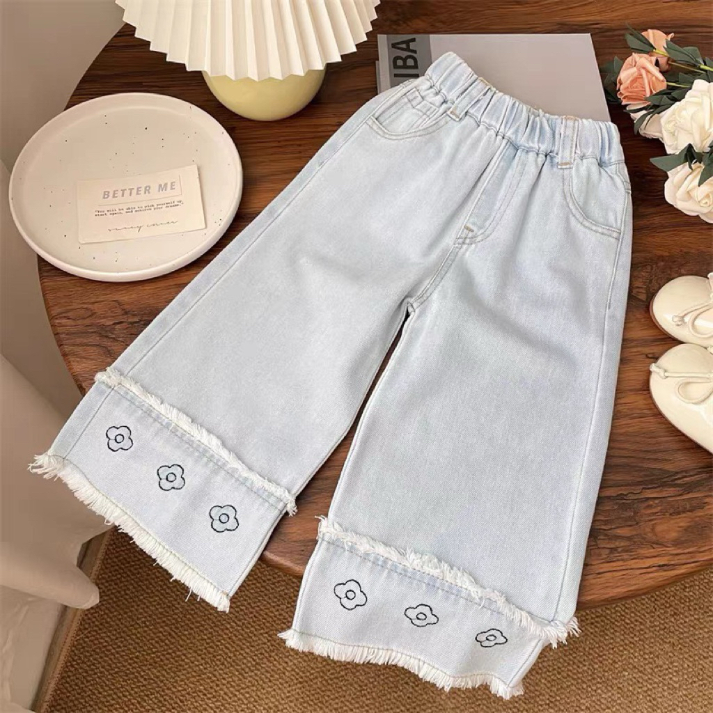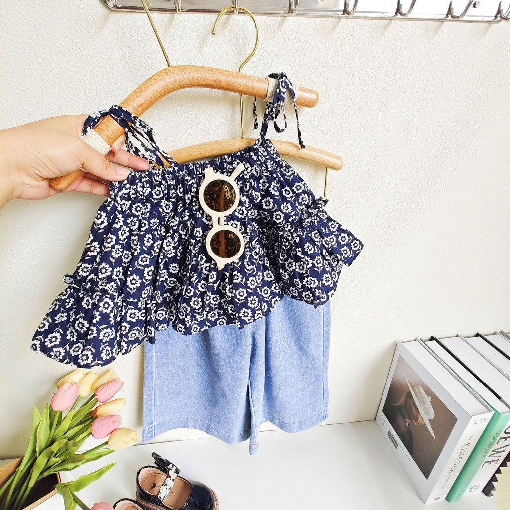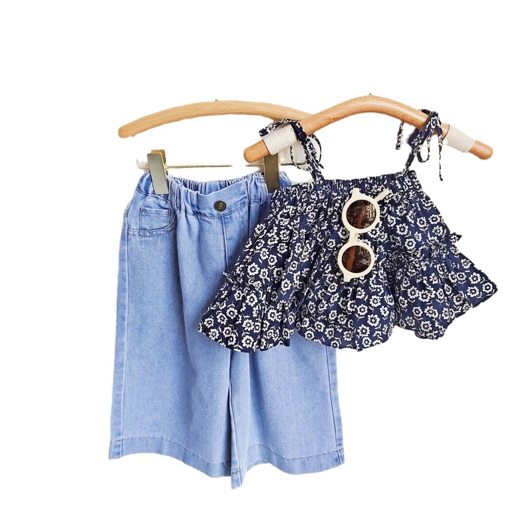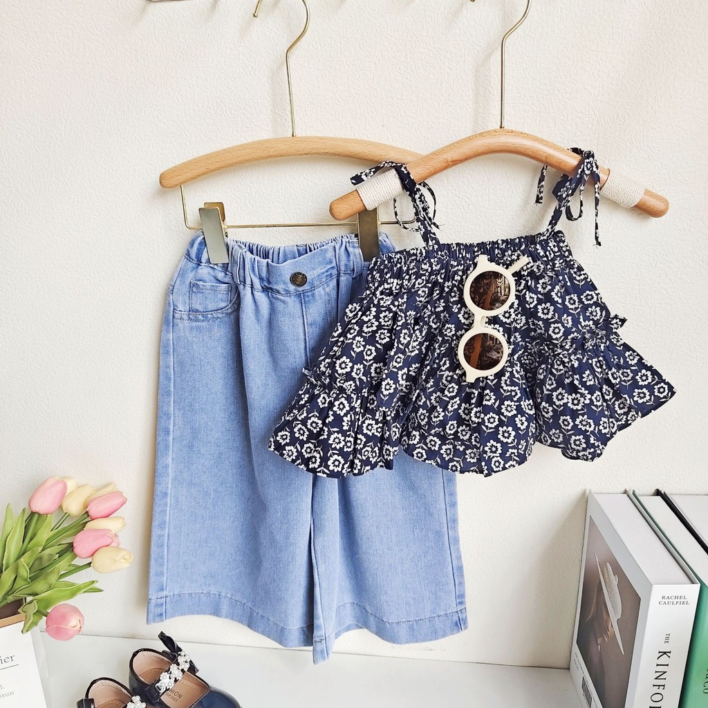 [Namsaii kids]?พร้อมส่ง?ชุดเซท2ชิ้น ชุดเด็กผู้หญิง เสื้อสายเดี่ยวลายดอกไม้ + กางเกงยีนส์ขากว้าง