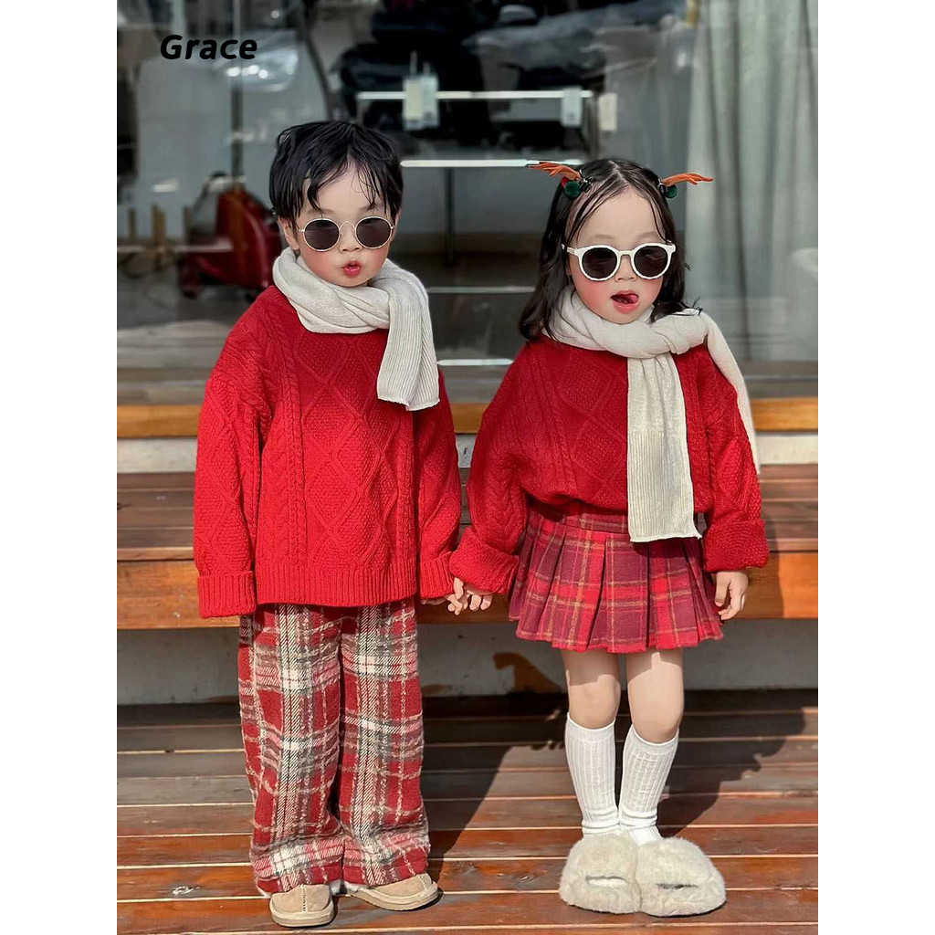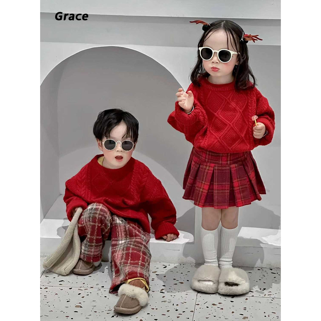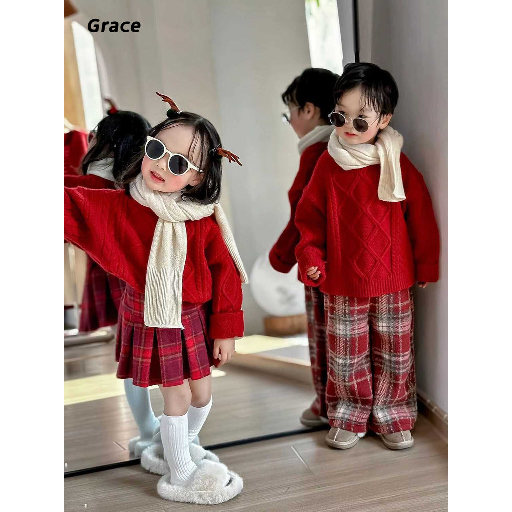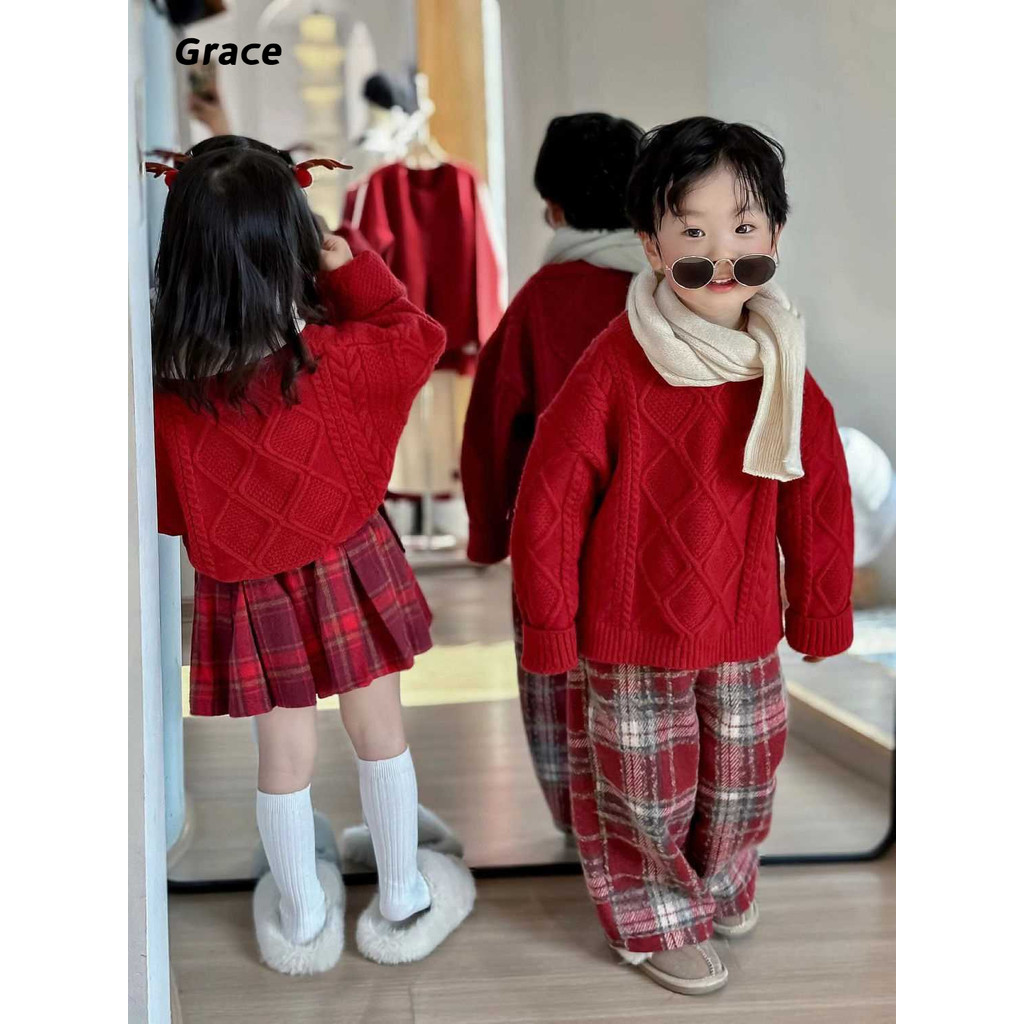 [Grace]เสือกันหนาวเด็กฤดูหนาวสไตล์ใหม่กลางเด็กเล็ก เด็กทารกปีไหม่สวมใส่เสื้อกันหนาวคริสต์มาสขนแกะลาย…GR069#