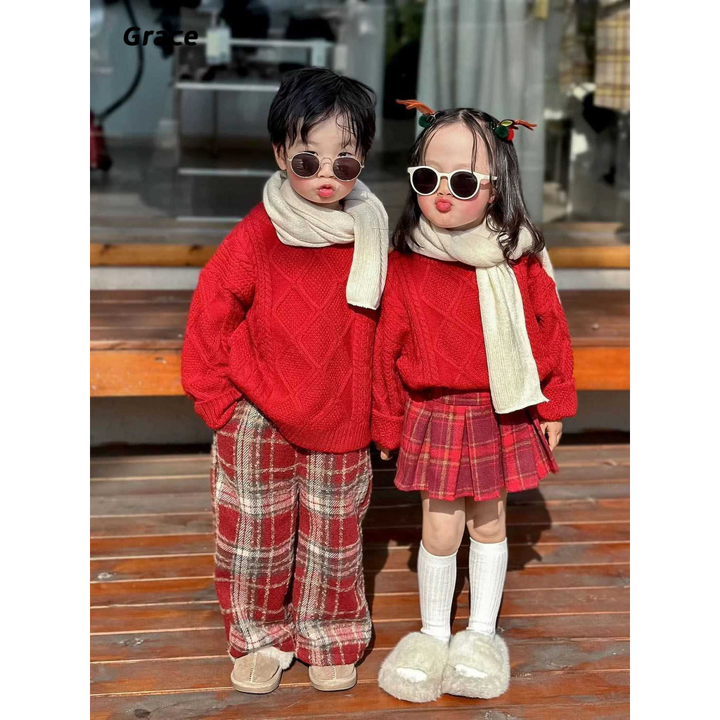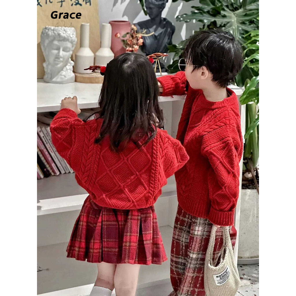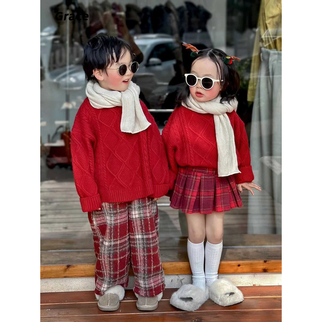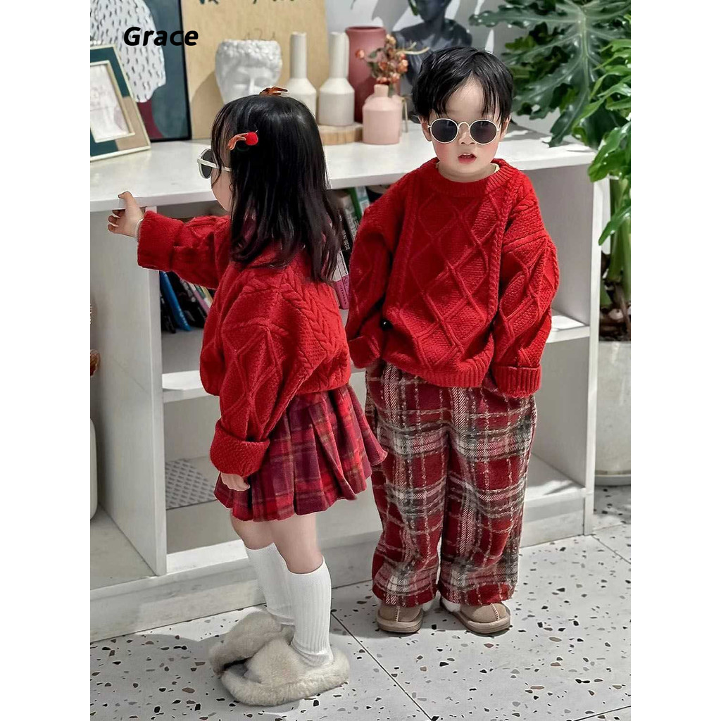 [Grace]เสือกันหนาวเด็กฤดูหนาวสไตล์ใหม่กลางเด็กเล็ก เด็กทารกปีไหม่สวมใส่เสื้อกันหนาวคริสต์มาสขนแกะลาย…GR069#