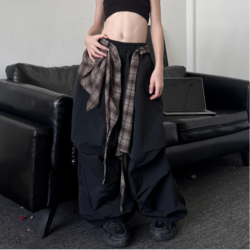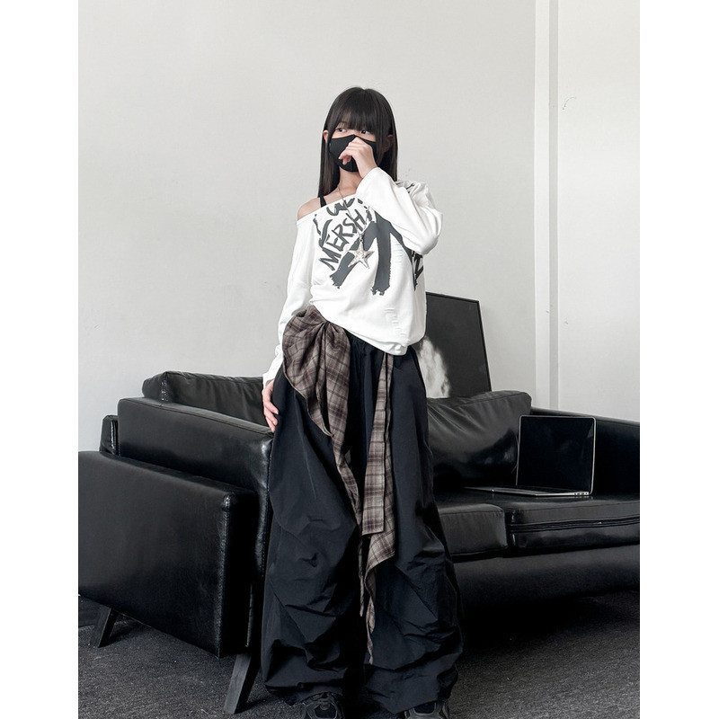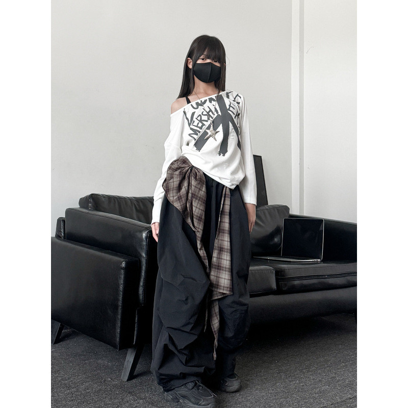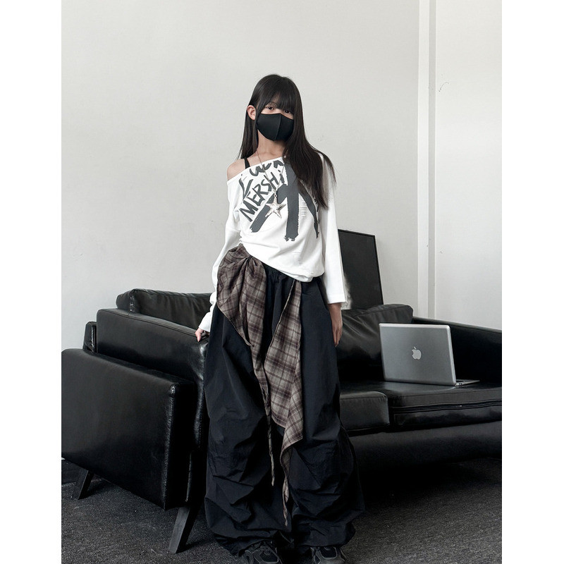 [KeDaYa] พร้อมส่ง เสื้อครอปเปิดไหล่สีขาว กางเกงสตรีทอเมริกัน ผ้าคาดเอวลายตาราง ชุดเต้นฮิปฮอปเด็กผู้หญิง แฟชั่น Y2K OOTD