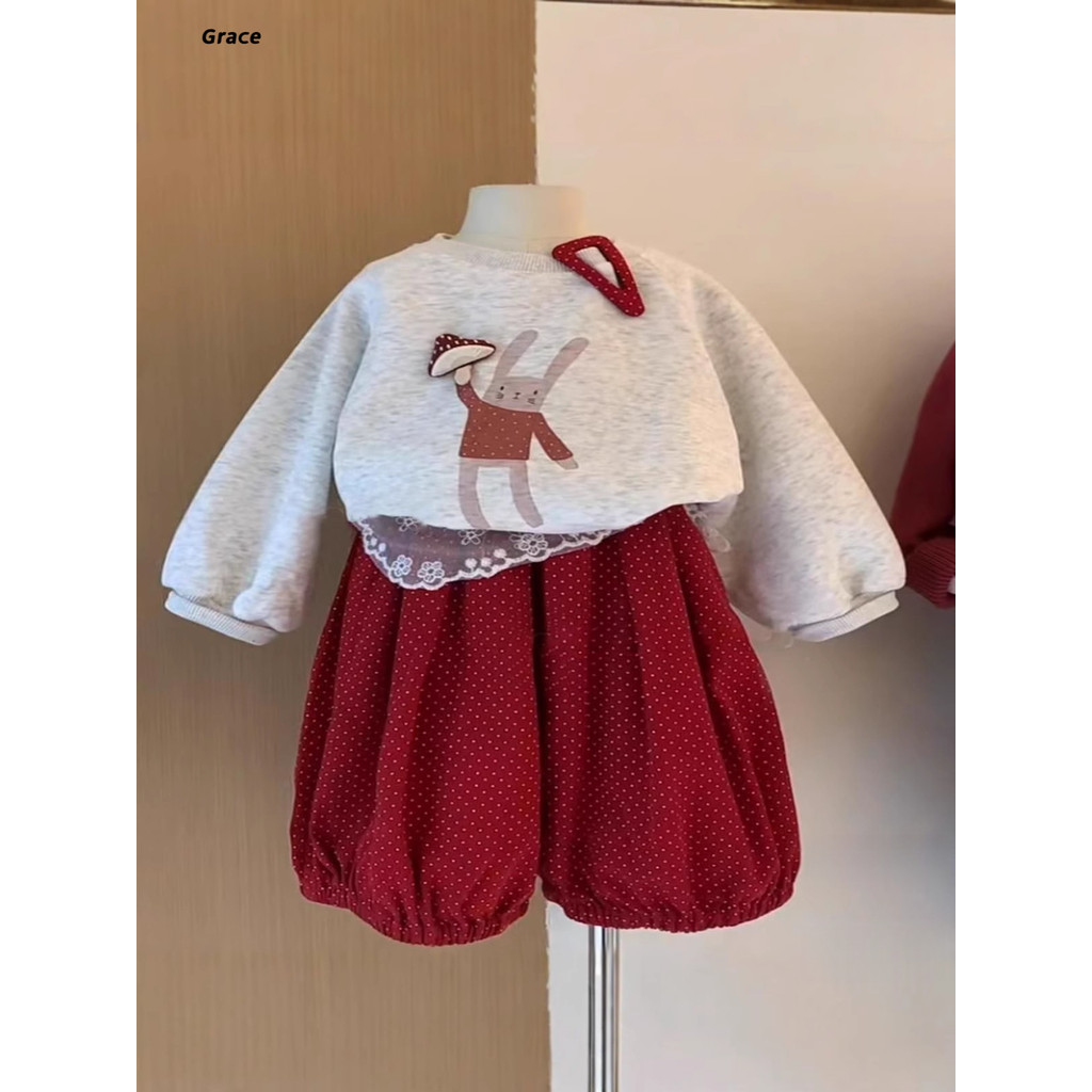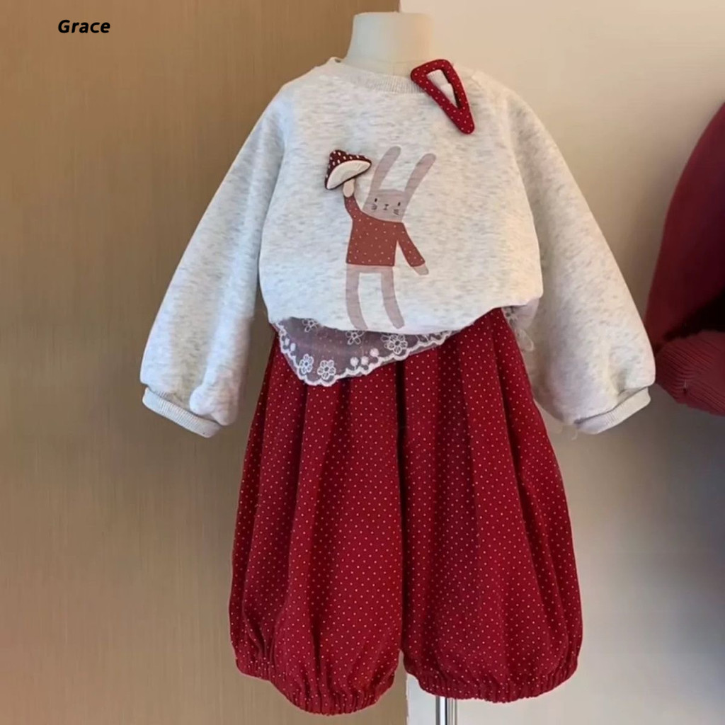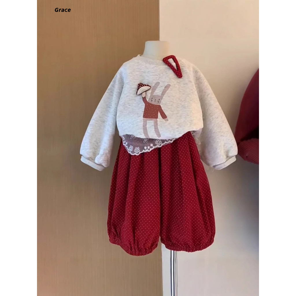 [Grojoy] (คลังสินค้าพร้อม) ชุดเสื้อสเวตเตอร์เด็กผู้หญิง เวอร์ชั่นเกาหลี 2025 เสื้อกระต่าย+กางเกงสูทสองชิ้น GRL026 #