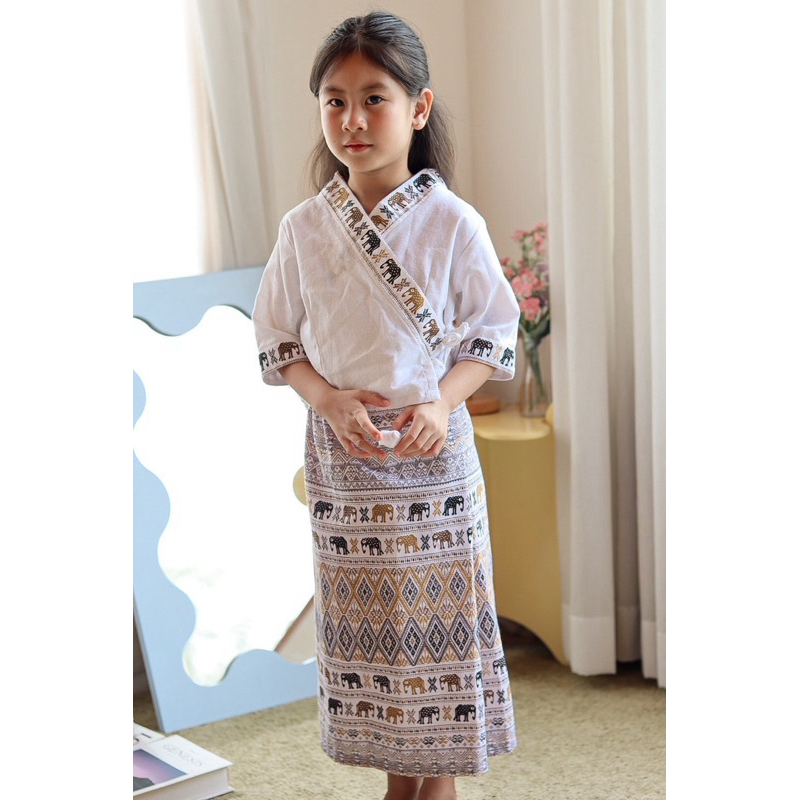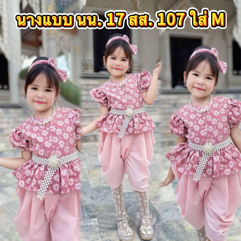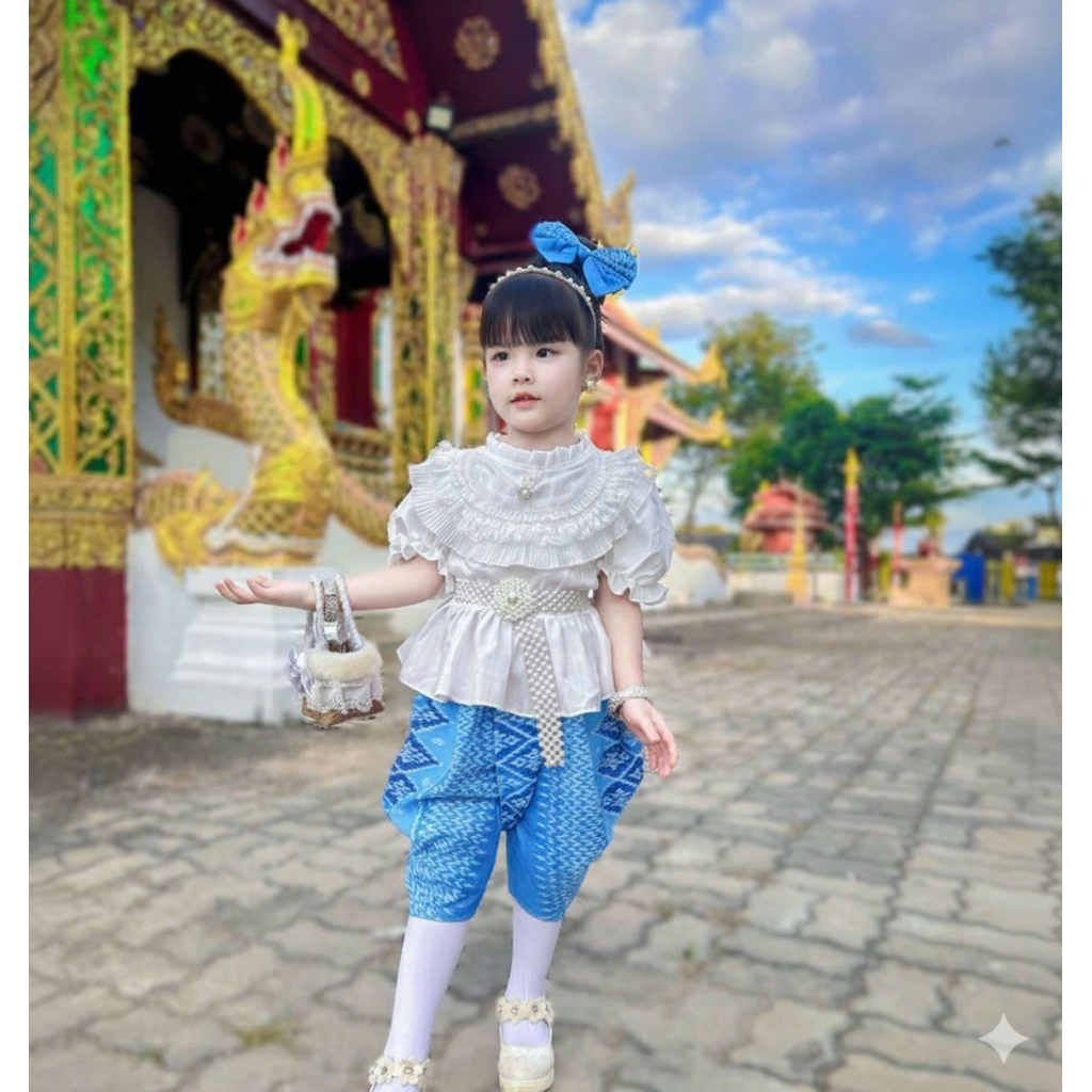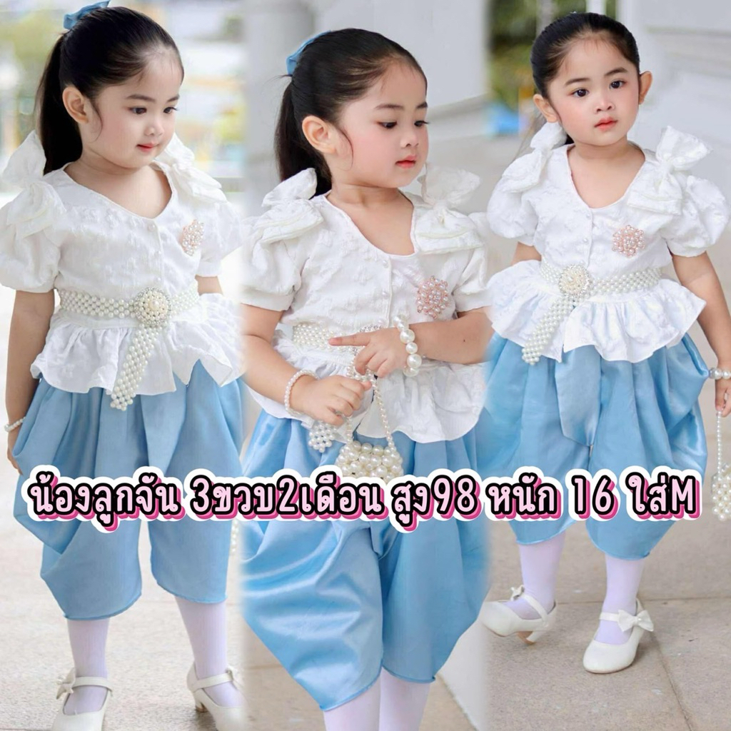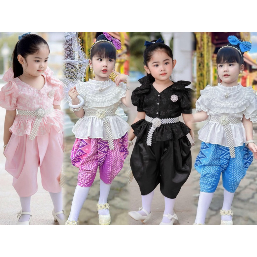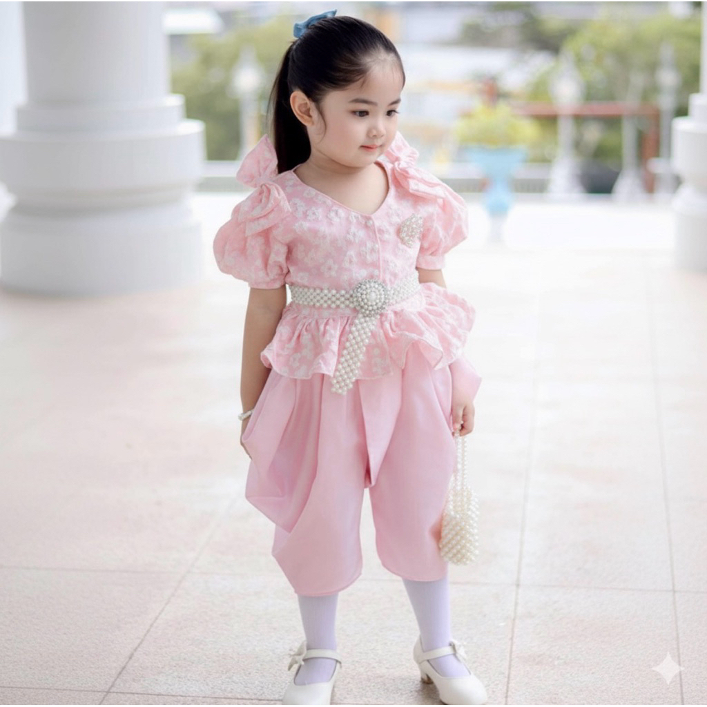 (รหัสKK)ชุดไทยเด็กผู้หญิงชุดไทยสวยๆใส่ทำบุญ ออกงาน ไปโรงเรียน ได้หมด งาน 2ชิ้นเสื้อ+ จงกระเบนแถมกิ๊บติดผม ชุดไทยประยุกต์