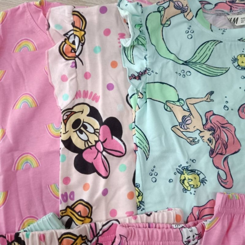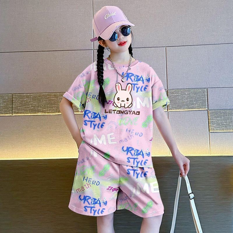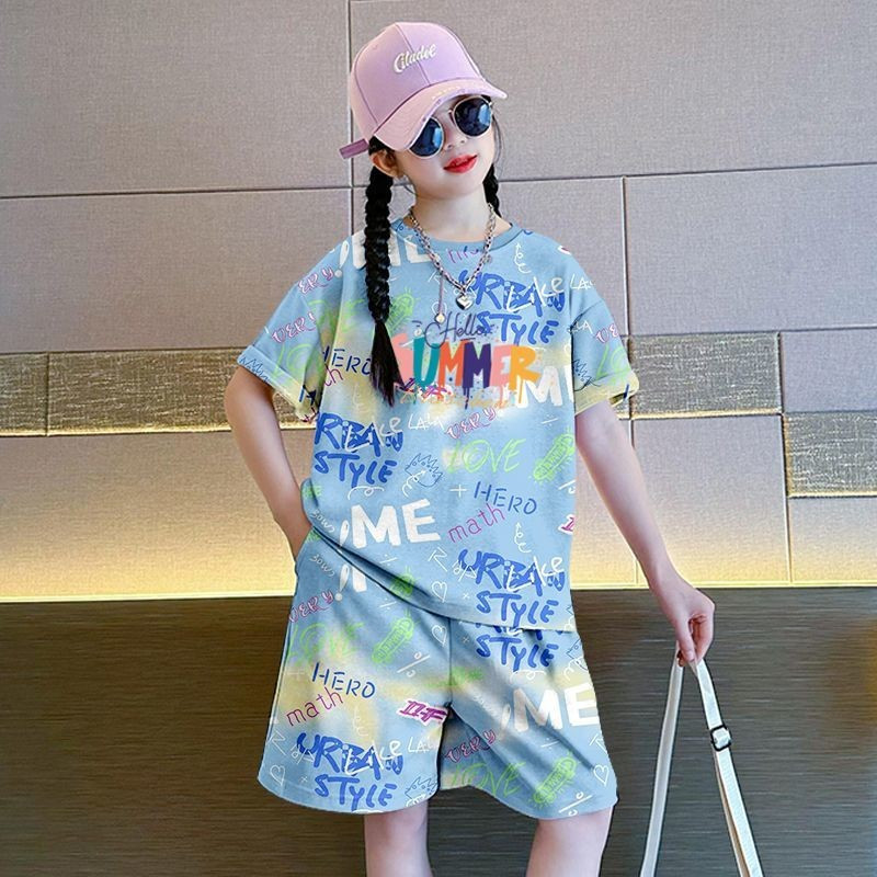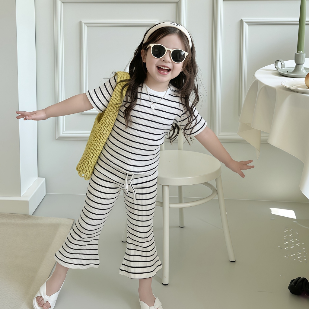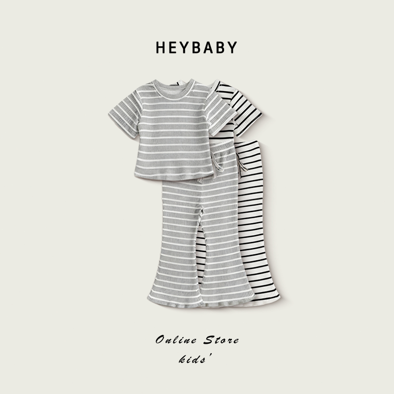 2-12 ปี ชุดเด็กผู้หญิง ชุดเสื้อผ้าแฟชั่น แขนสั้นลาย+กางเกงขาบาน 2 ชิ้น แบบบาง สไตล์เกาหลี ลำลอง สําหรับเด็กผู้หญิง