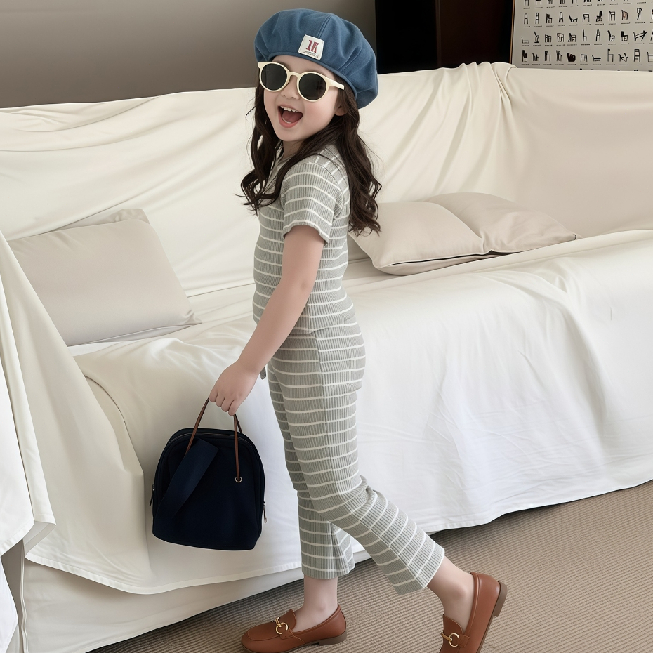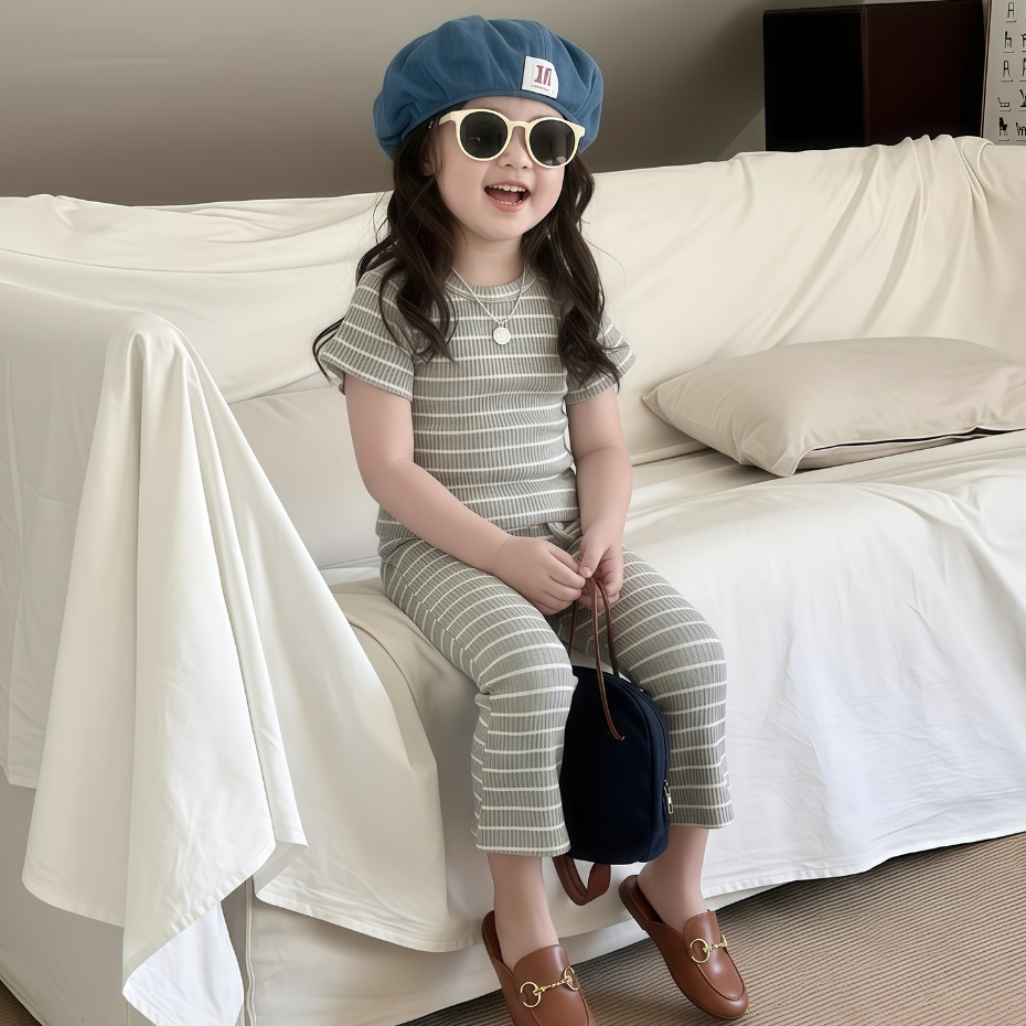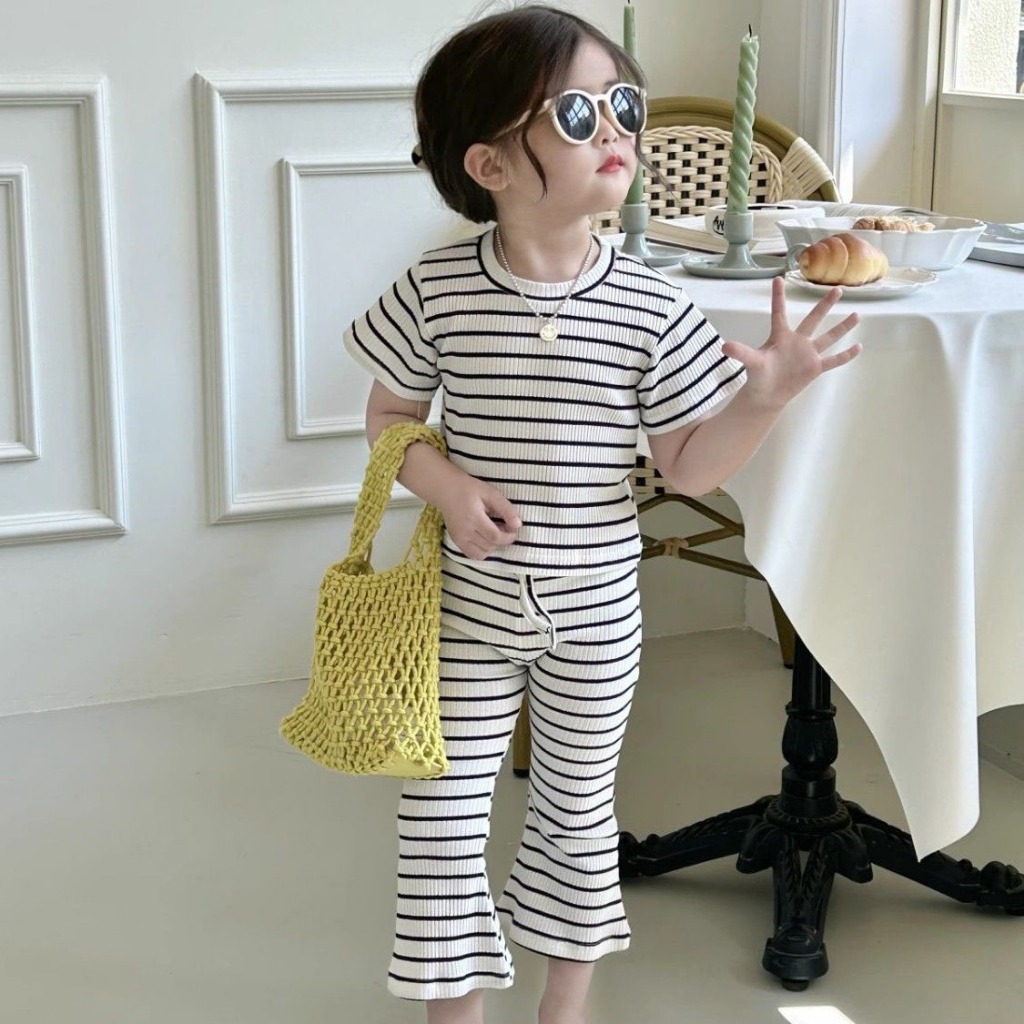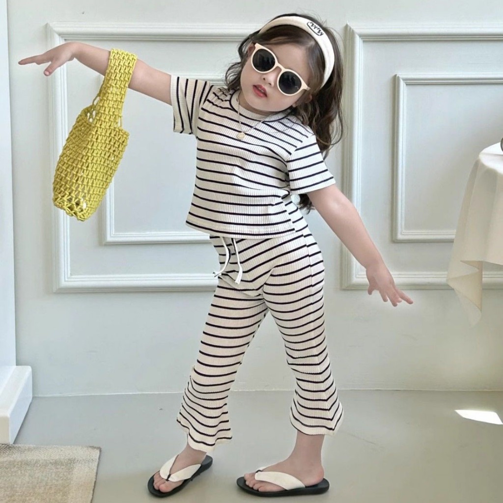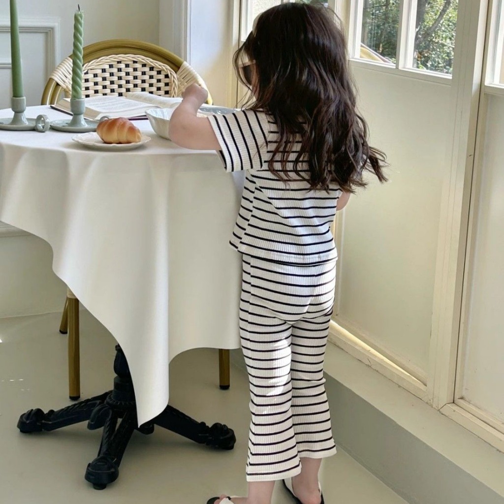 2-12 ปี ชุดเซทเด็กผู้หญฺิง สไตล์เกาหลี แฟชั่น แขนสั้น+กางเกงลายทาง ใส่สบาย