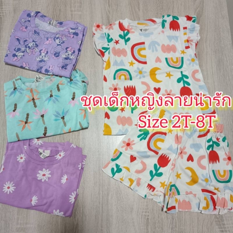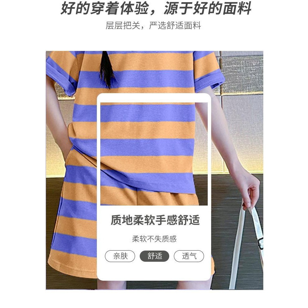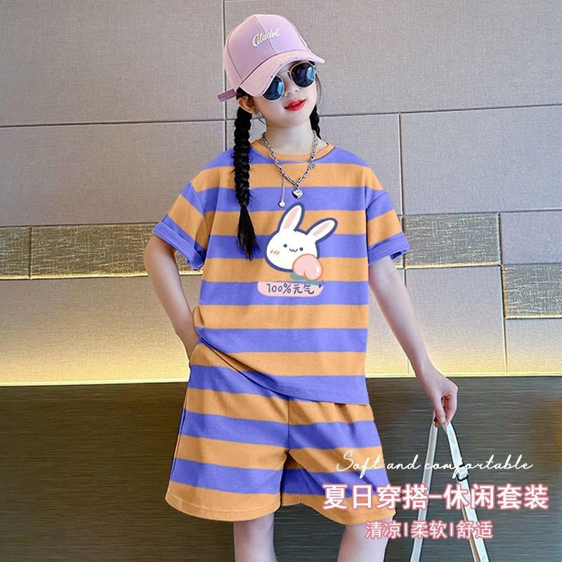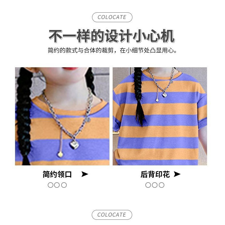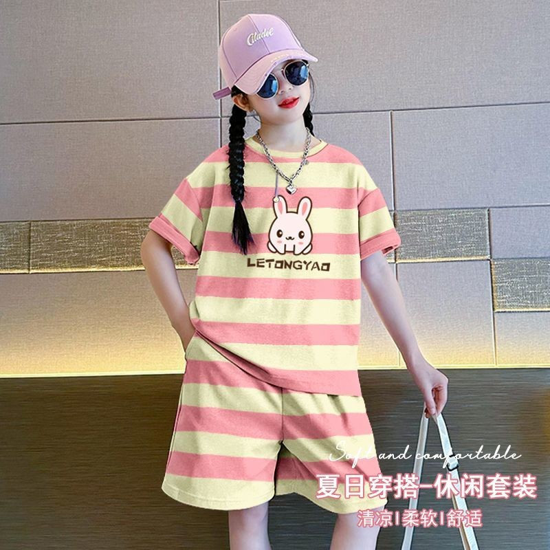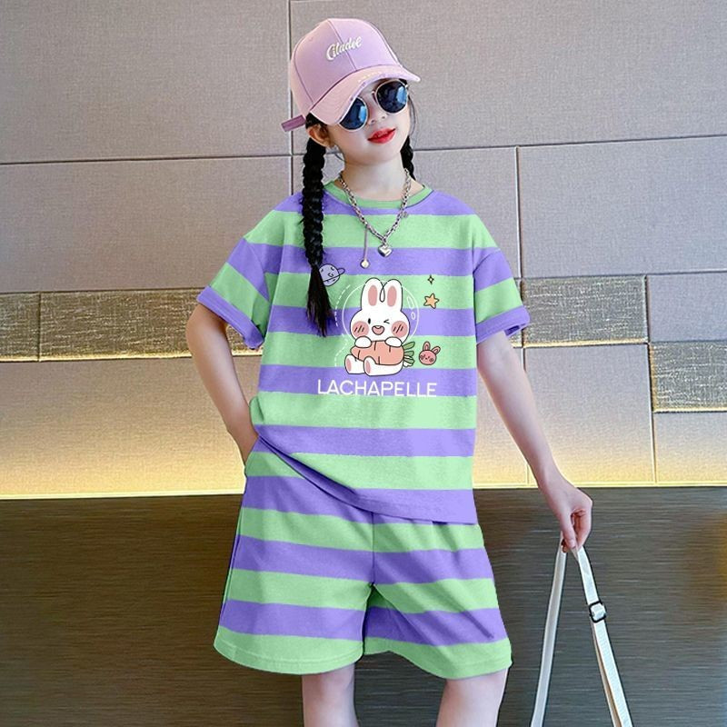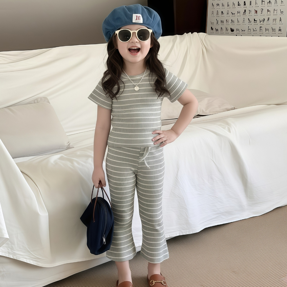2-12 ปี ชุดเซทเด็กผู้หญฺิง สไตล์เกาหลี แฟชั่น แขนสั้น+กางเกงลายทาง ใส่สบาย