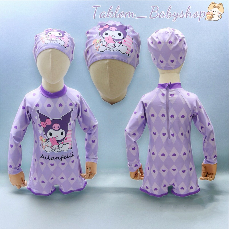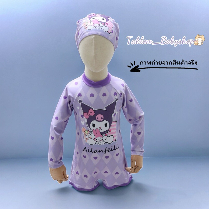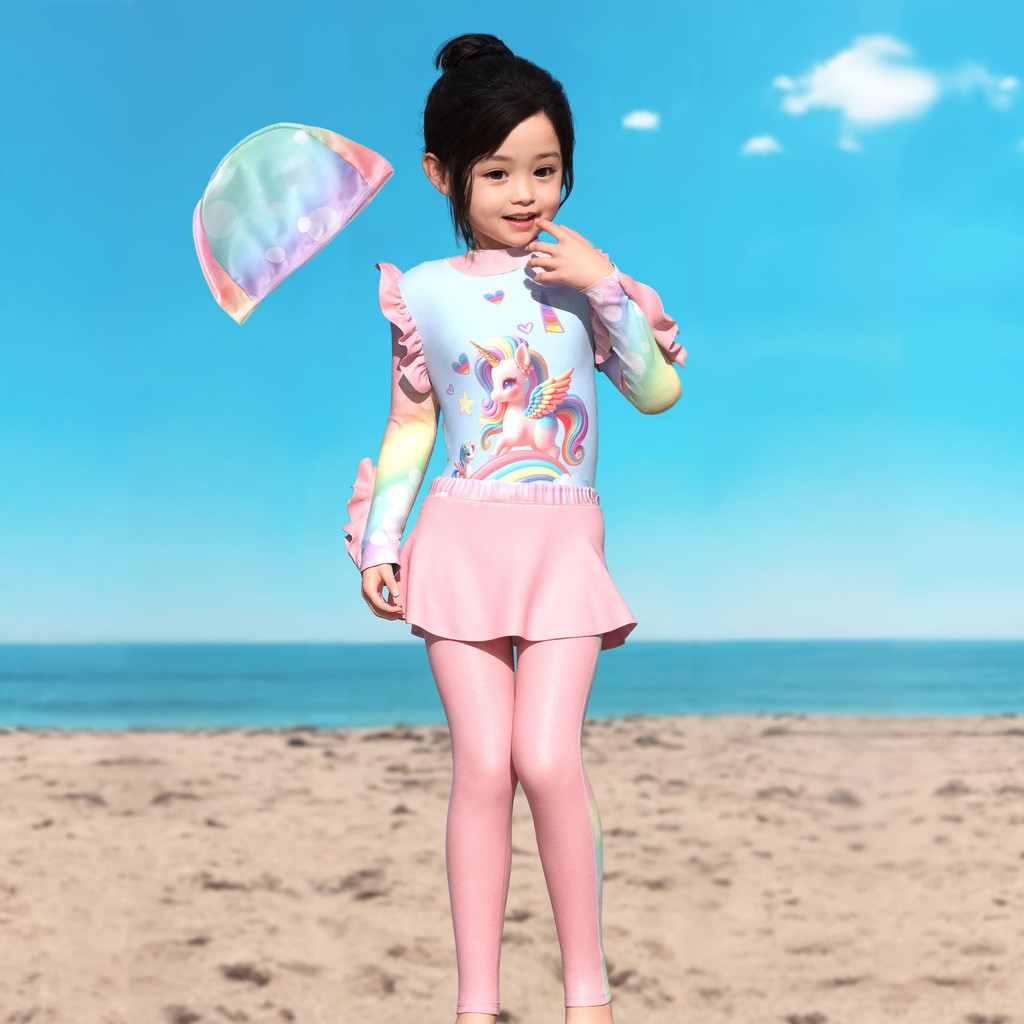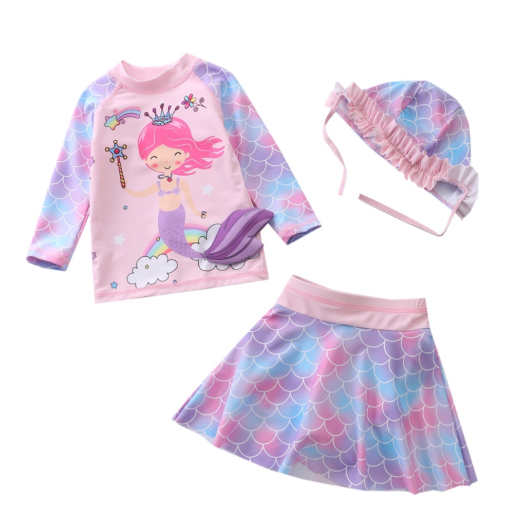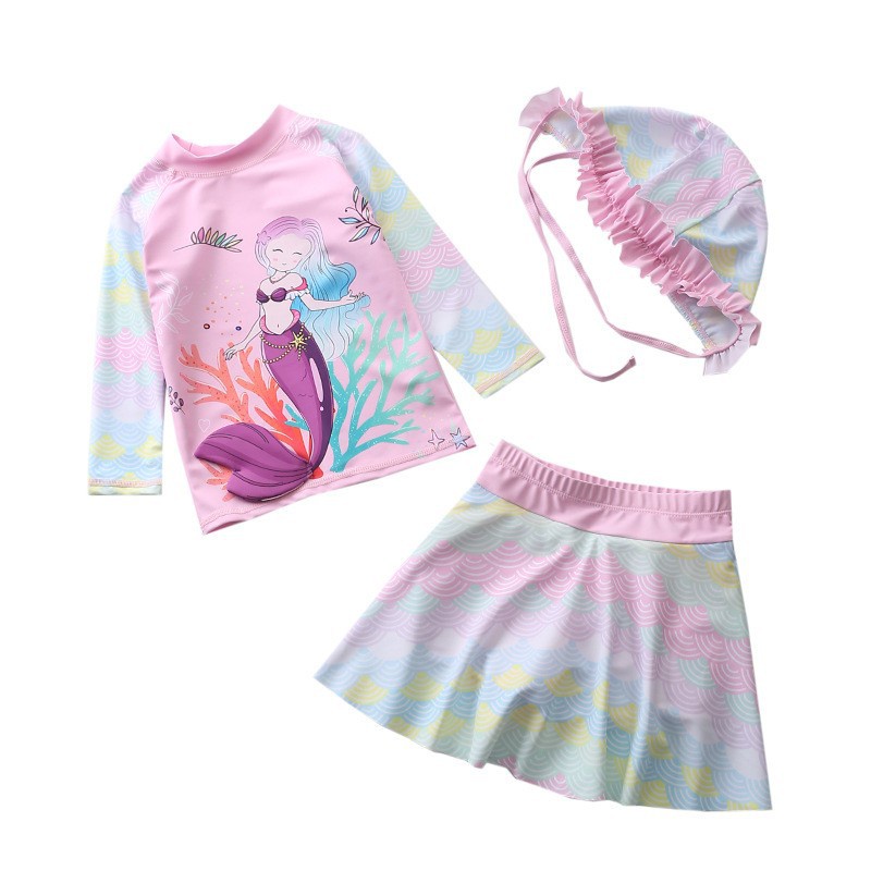 ชุดว่ายน้ำเด็กผู้หญิง แขนยาว ชุดว่ายน้ำกระโปรง ชุด 3 ชิ้น พร้อมหมวกw