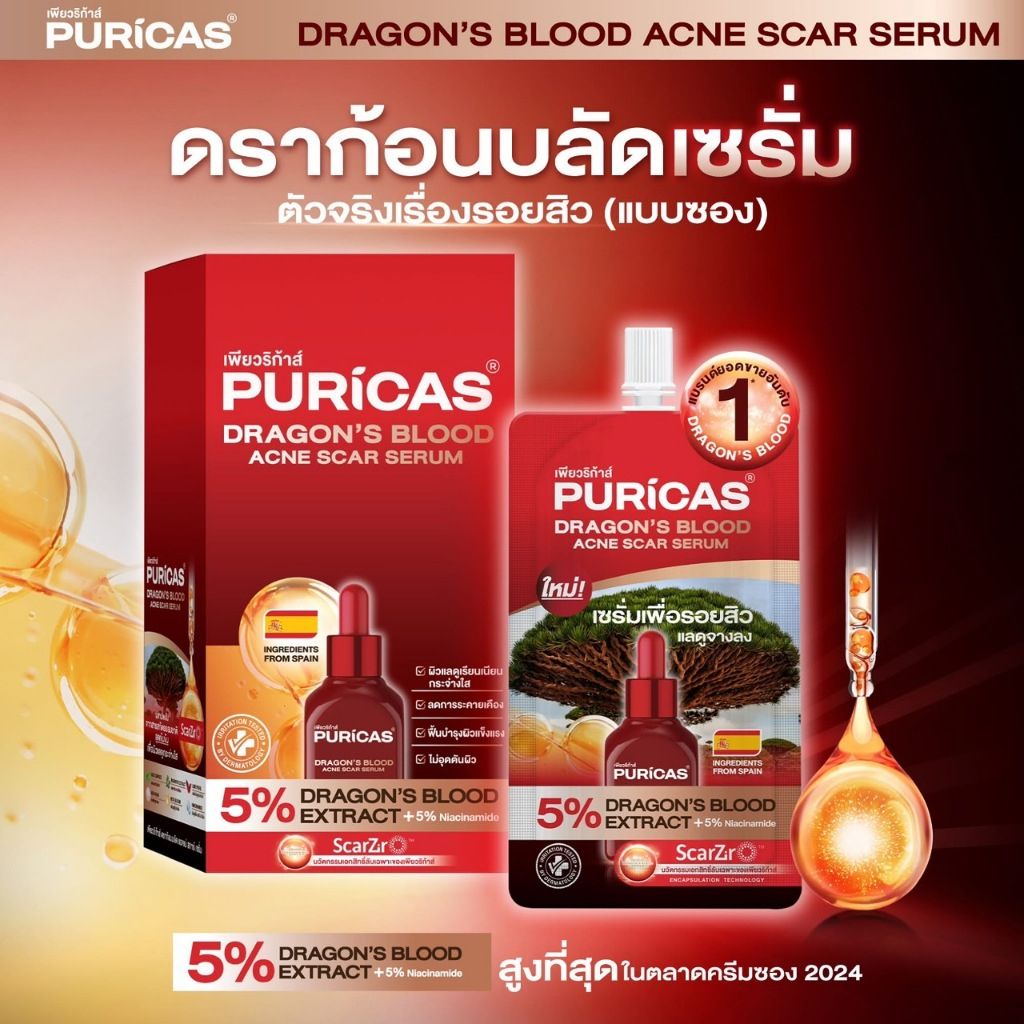 เซรั่มเพียวริก้าส์ ดราก้อนบลัด Puricas Dragon’s Blood Acne Scar Serum (มี 2 ตัวเลือก)