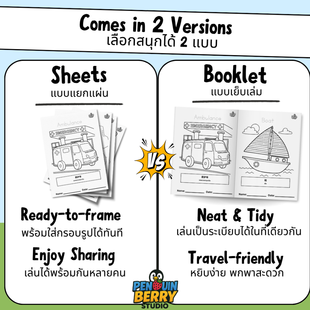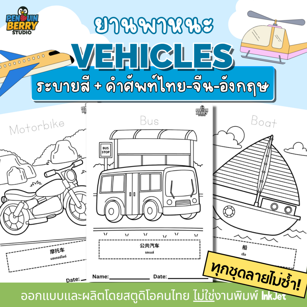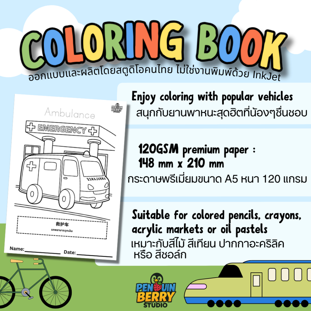 สมุดระบายสี Vehicles ยานพาหนะ รถยนต์ เครื่องบิน เรือ รถ มอเตอร์ไซด์ Penguin Berry Studio เรียนภาษาอังกฤษ เรียนภาษาจีน