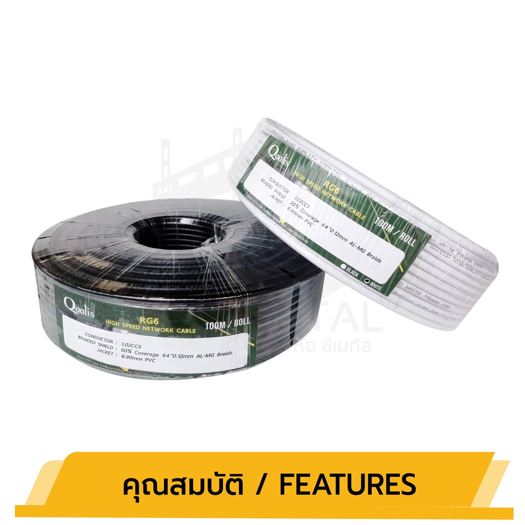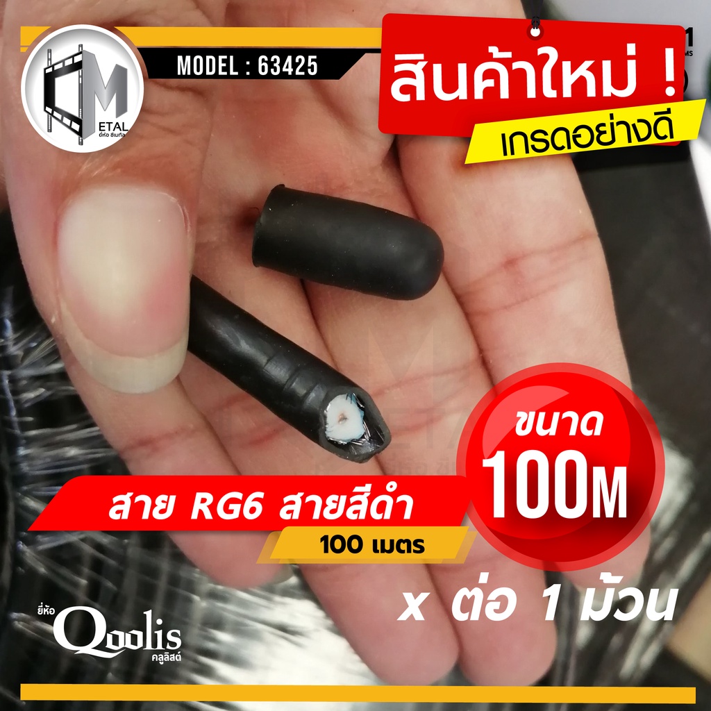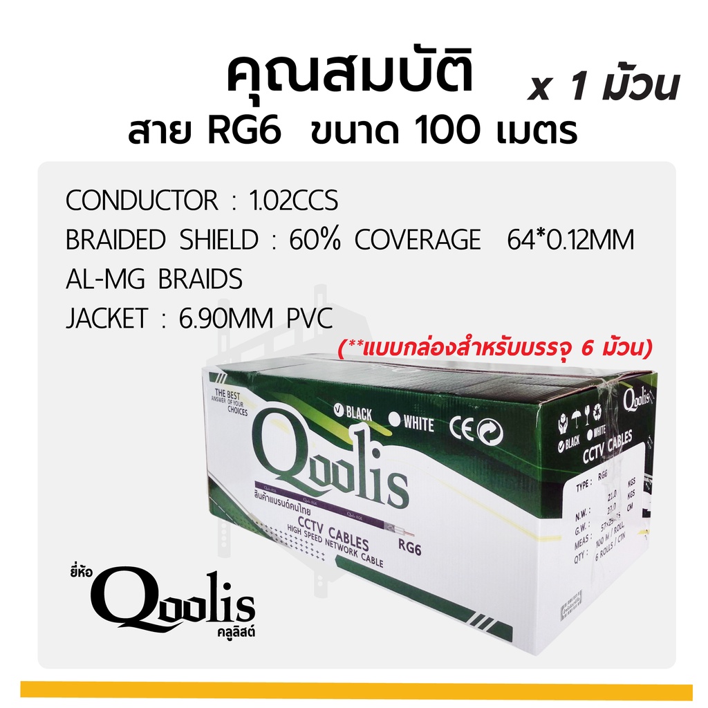 สายสัญญาณ RG6 “สีดำ” ยี่ห้อ Qoolis ขนาด (100 เมตร x 1 ม้วน) รหัส 63428 สายนำสัญญาณกล้องวงจรปิด RG6 ดำ สีดำ