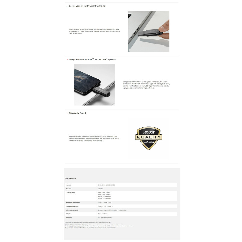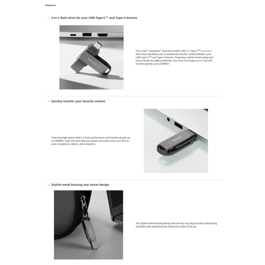 LEXAR D400 32GB/64GB/128GB Dual USB Type-C/A USB 3.1 Flash Drive 2-in-1 (แฟลชไดรฟ์ทูอินวัน)