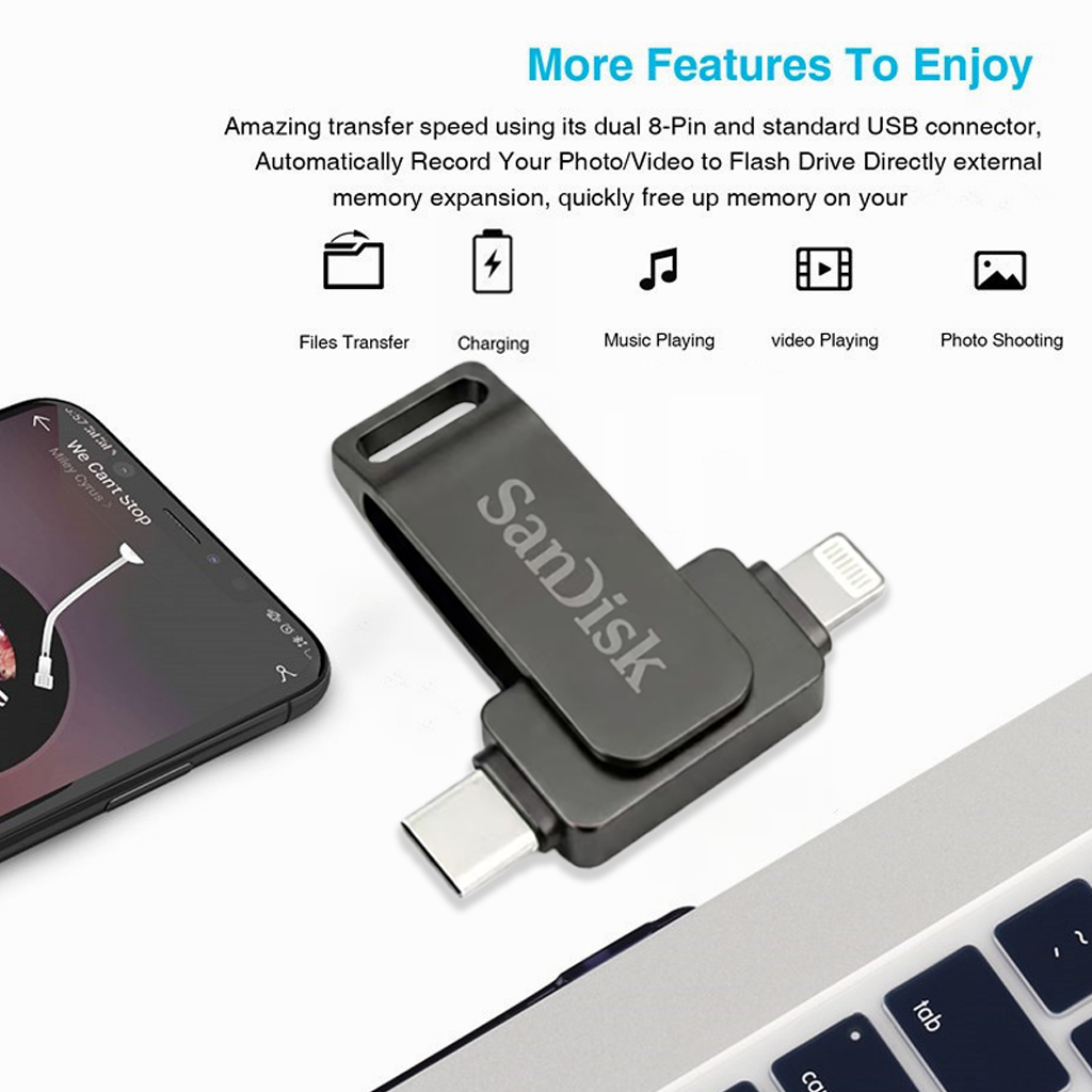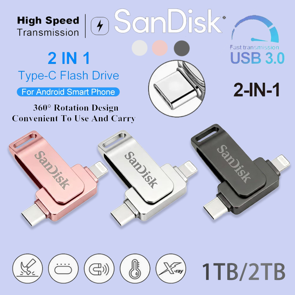 Type-C 2 in 1 โทรศัพท์มือถือ U DiskFlash Drive Dual Drive Flash Memory USB 3.0 ความเร็วสูง Memory Stick 64GB/1TB/2TB OTG แฟลชไดรฟ์โลหะกันน้ําแบบพกพา แฟลชไดรฟ์ 2in1 หัวต่อ Lightning และ USB Type-C