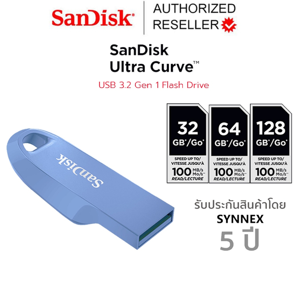 SanDisk Ultra Curve USB 3.2 Gen1 Flash Drive Blue ประกัน Synnex 5 ปี แฟลซไดรฟ์ (SDCZ550-128G-G46NB)