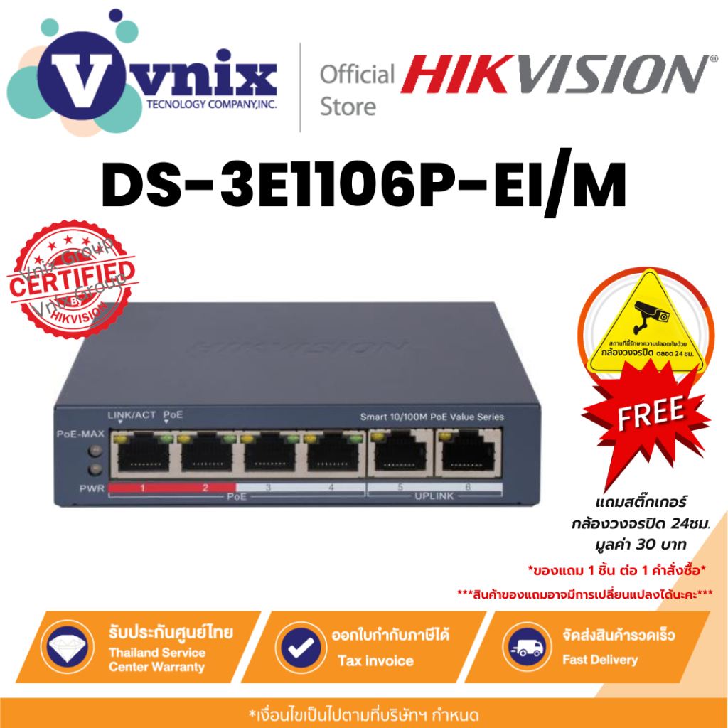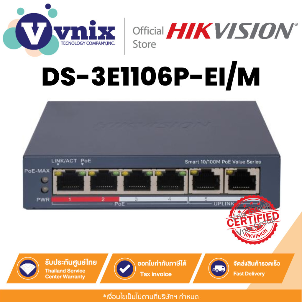 Hikvision DS-3E1106P-EI/M สวิตช์ 4 Port Fast Ethernet Smart POE Switch By Vnix Group