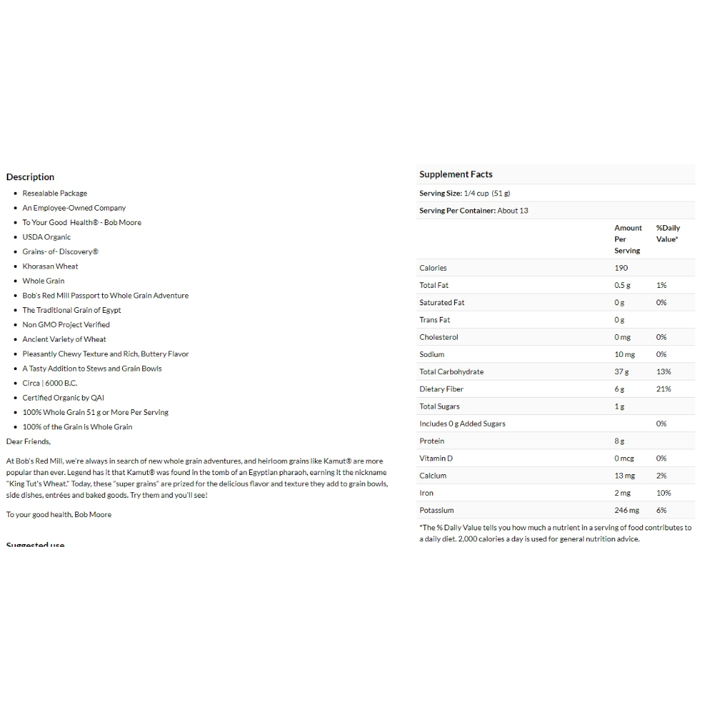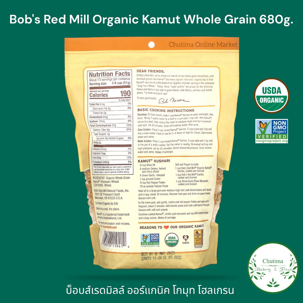 Bob’s Red Mill Organic Kamut Whole Grain 680g. บ็อบส์เรดมิลล์ ออร์แกนิค โกมุท โฮลเกรน