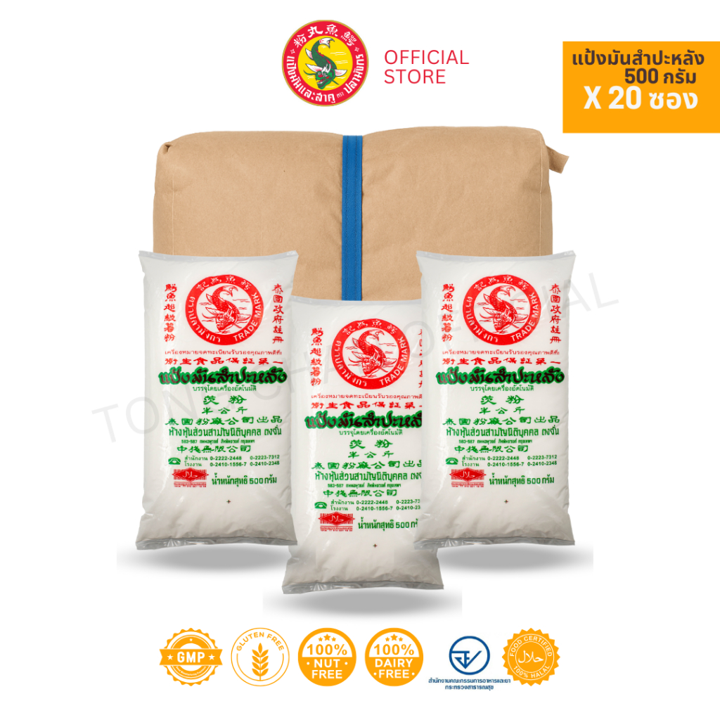 20 ซองแป้งมันสำปะหลัง ตราปลามังกร 1 มัดมี20 ซอง 1 ซองบรรจุ 500 กรัม เชือกน้ำเงิน