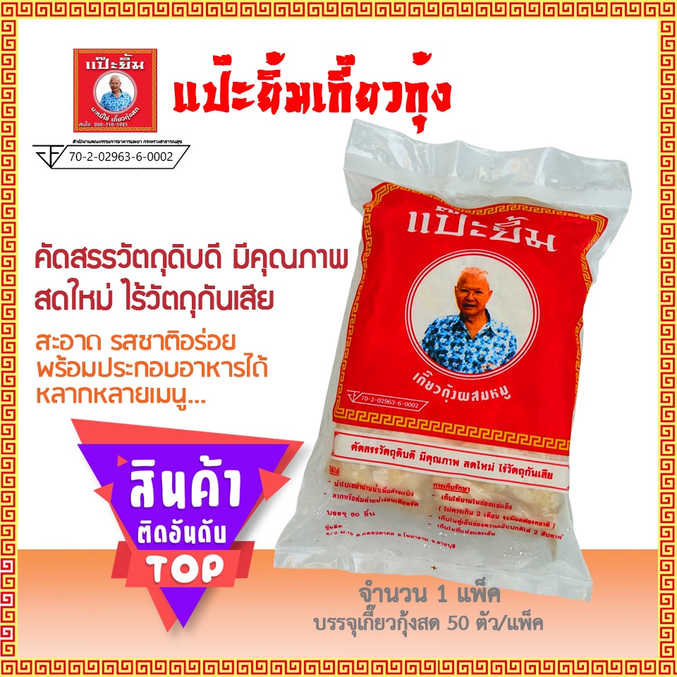 เกี๊ยวกุ้งผสมหมู แป๊ะยิ้ม (1 แพ็ค/50 ตัว) เกี๊ยวกุ้งสำเร็จ ไม่ใส่วัตถุกันเสีย อาหารแช่แข็ง พร้อมทาน อร่อยคุ้ม ลวก ทอด