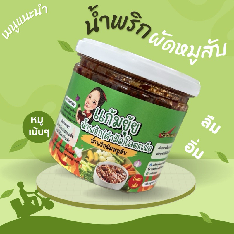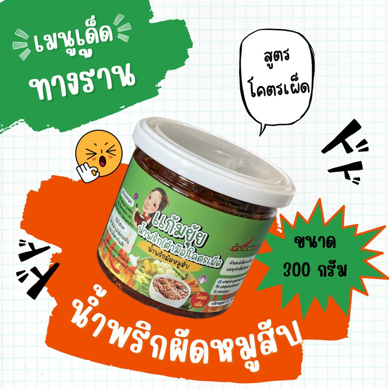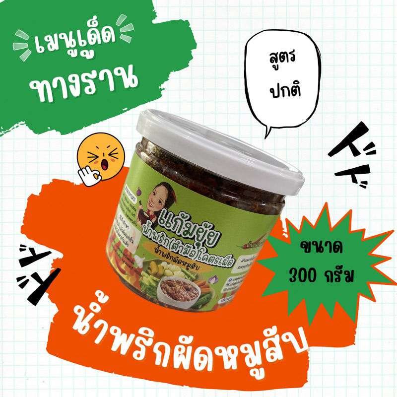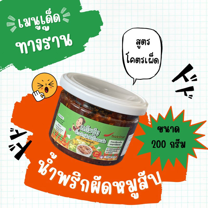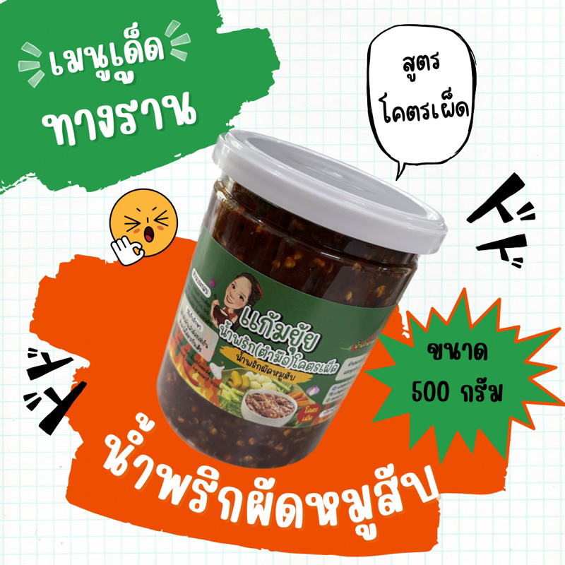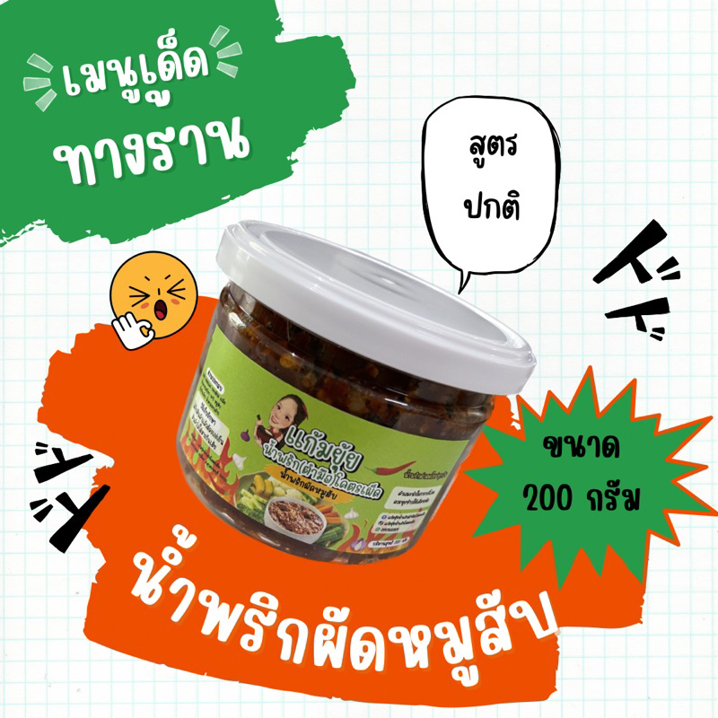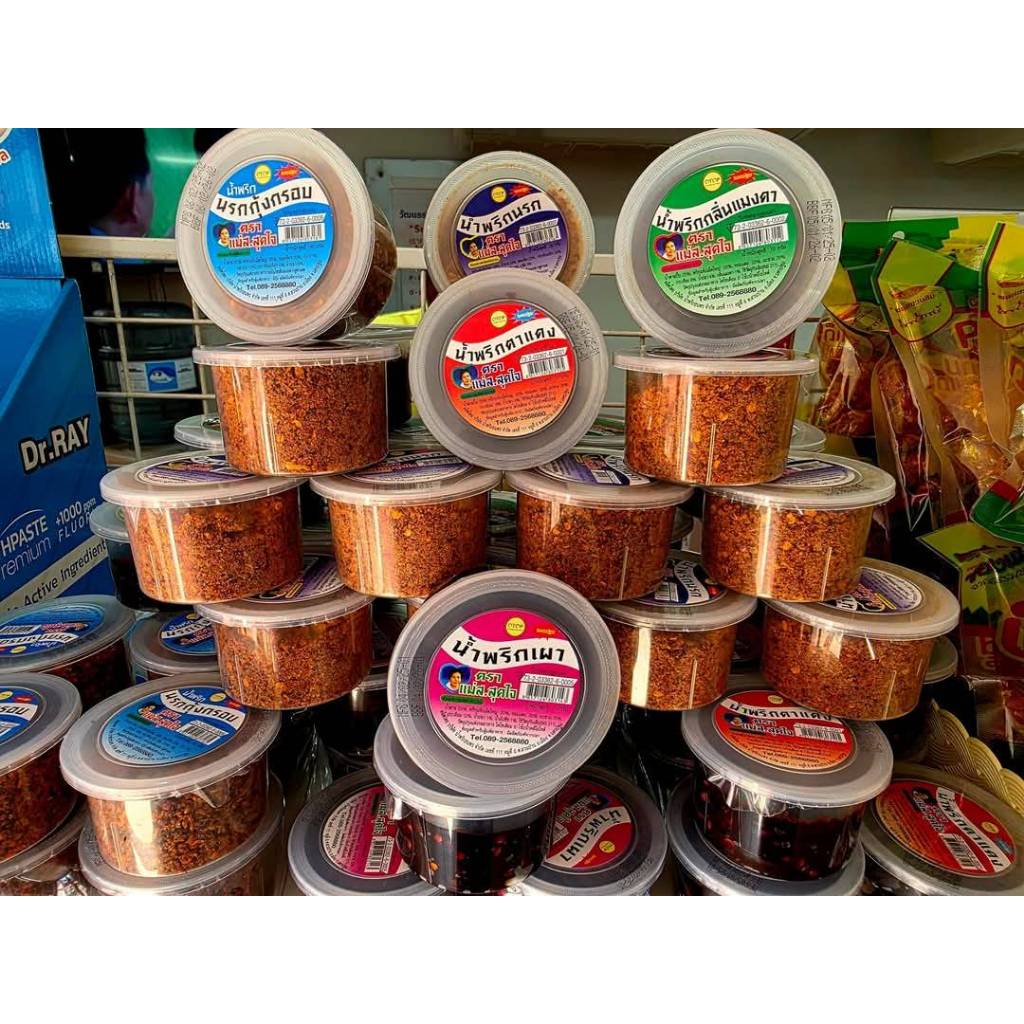 น้ำพริกน้ำย้อย น้ำพริกนรก น้ำพริกกากหมู สูตรเด็ด สูตรโบราณ แม่แอ๊ว มีขนาด 100 กรัม