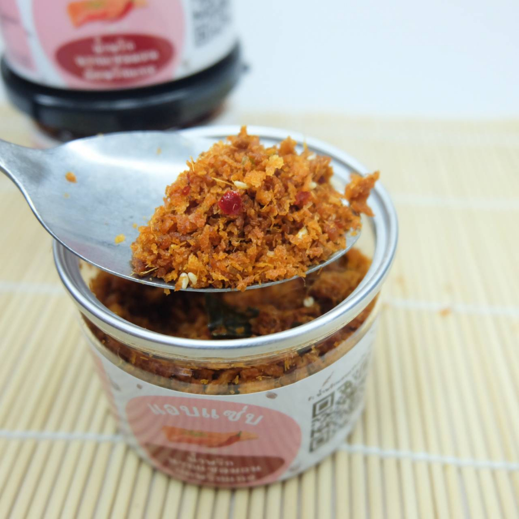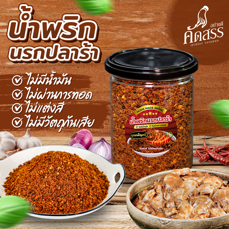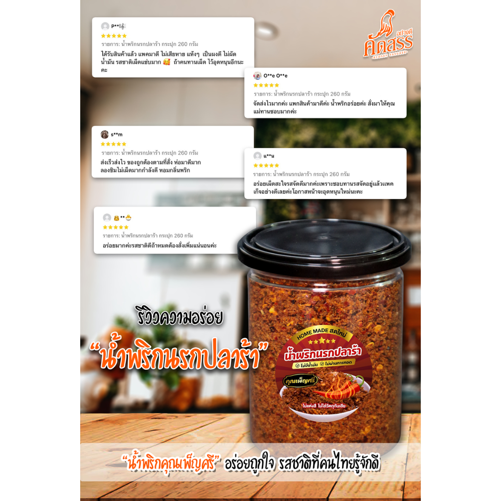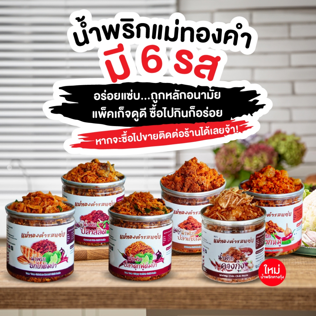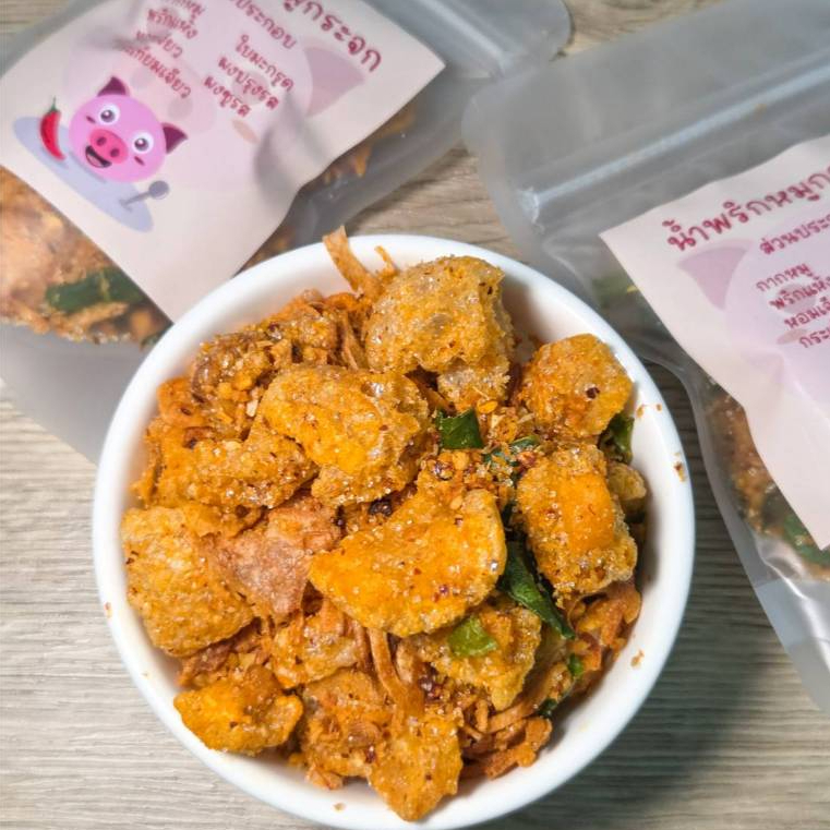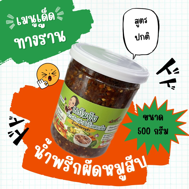 น้ำพริกน้ำย้อย น้ำพริกนรก น้ำพริกกากหมู สูตรเด็ด สูตรโบราณ แม่แอ๊ว มีขนาด 100 กรัม
