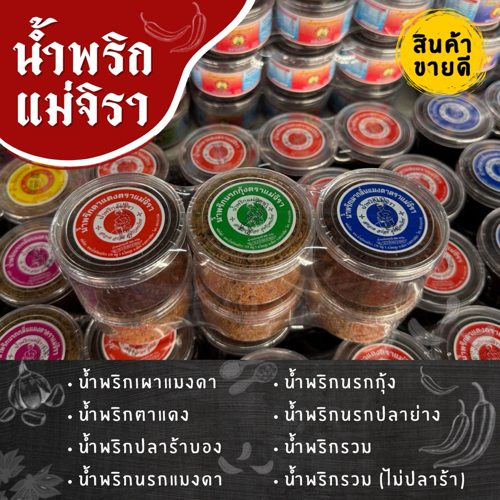น้ำพริกแม่จิรา น้ำพริกเผา น้ำพริกแมงดา น้ำพริกเผาแมงดา น้ำพริกนรกกุ้ง น้ำพริกปลาย่าง อร่อยแซ่บ สะอาด อยู่คู่ครัวไทยมานาน