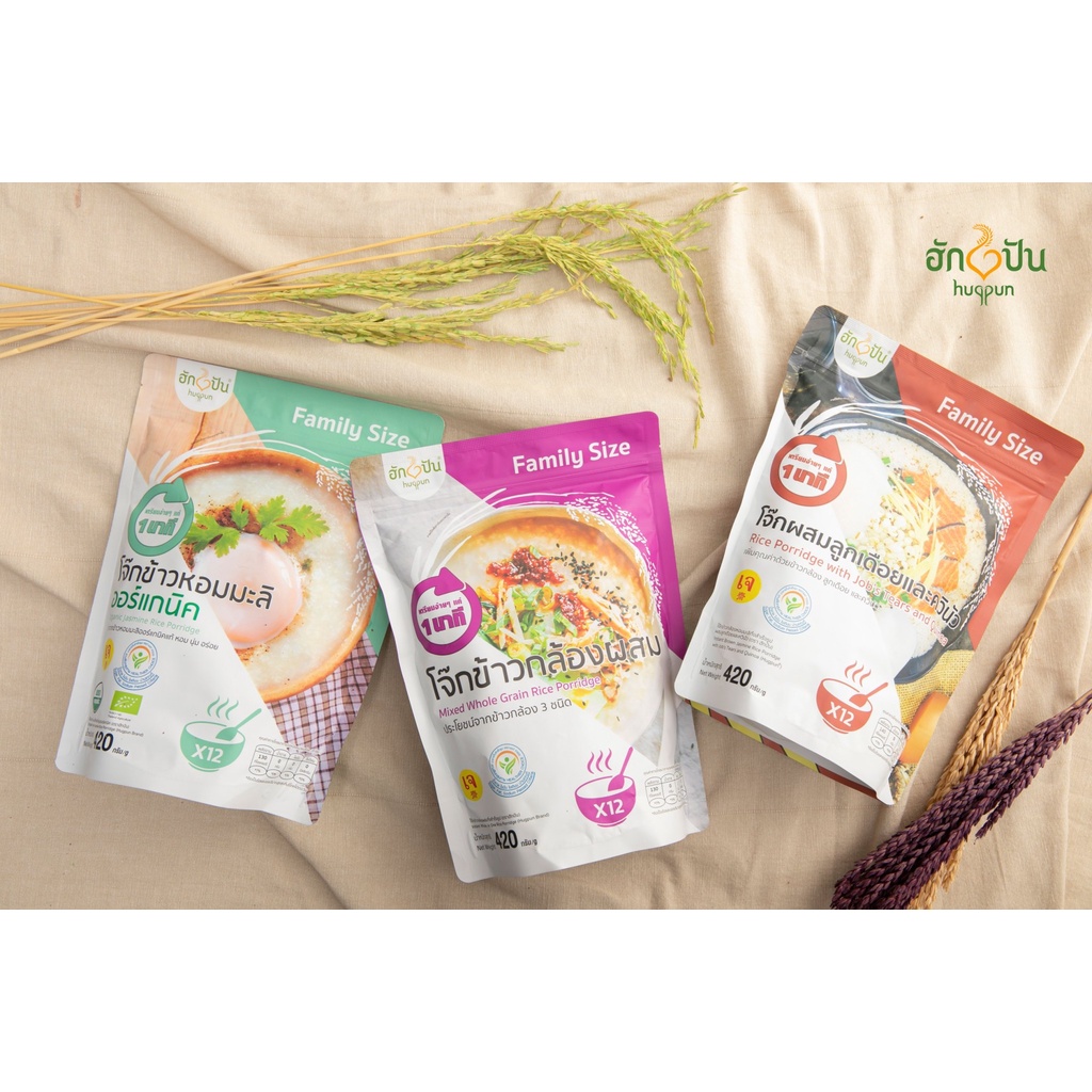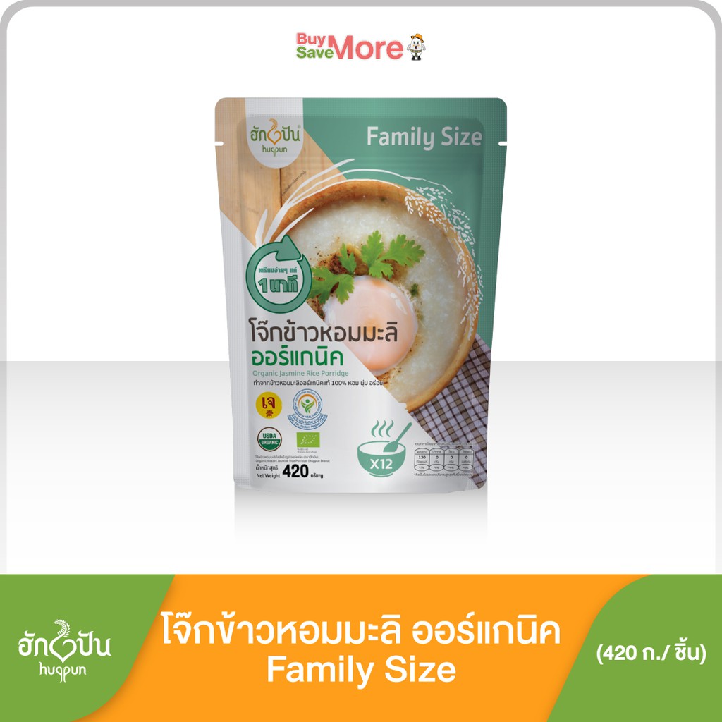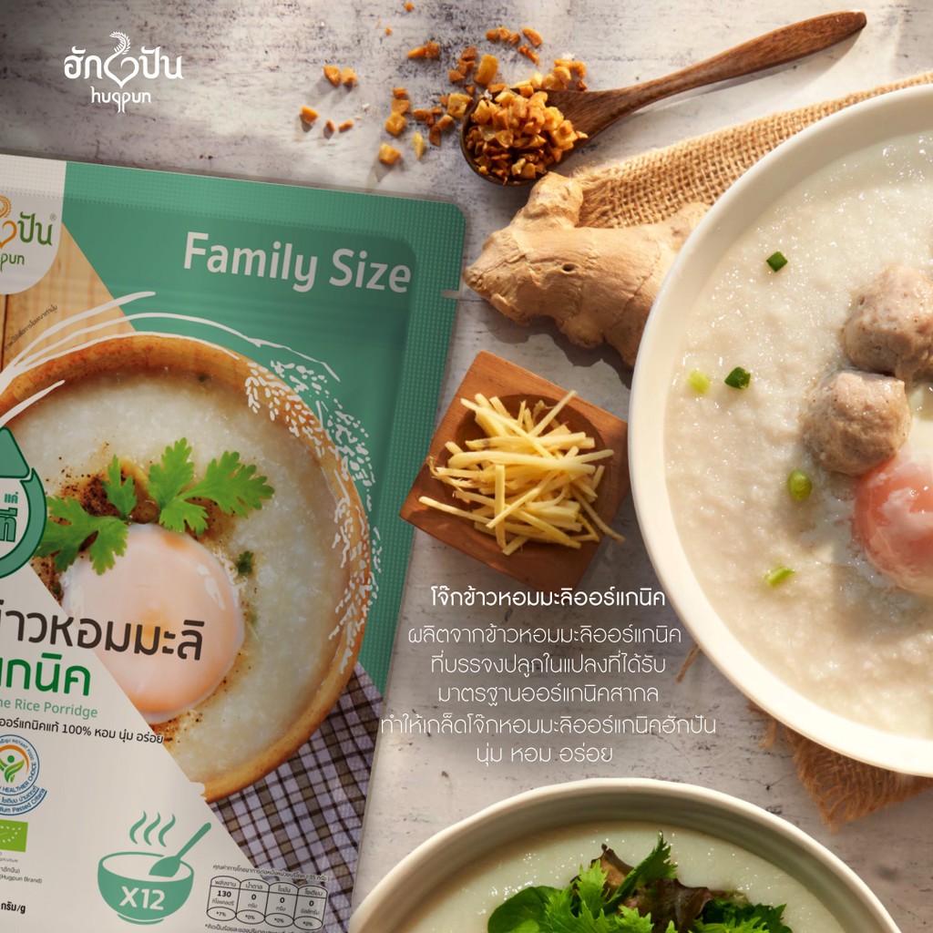 Family Size โจ๊กข้าวหอมมะลิ ออร์แกนิค กึ่งสำเร็จรูป ไม่ใส่ผงชูรส ไม่มีโซเดียม บรรจุ 420 ก. ฮักปัน