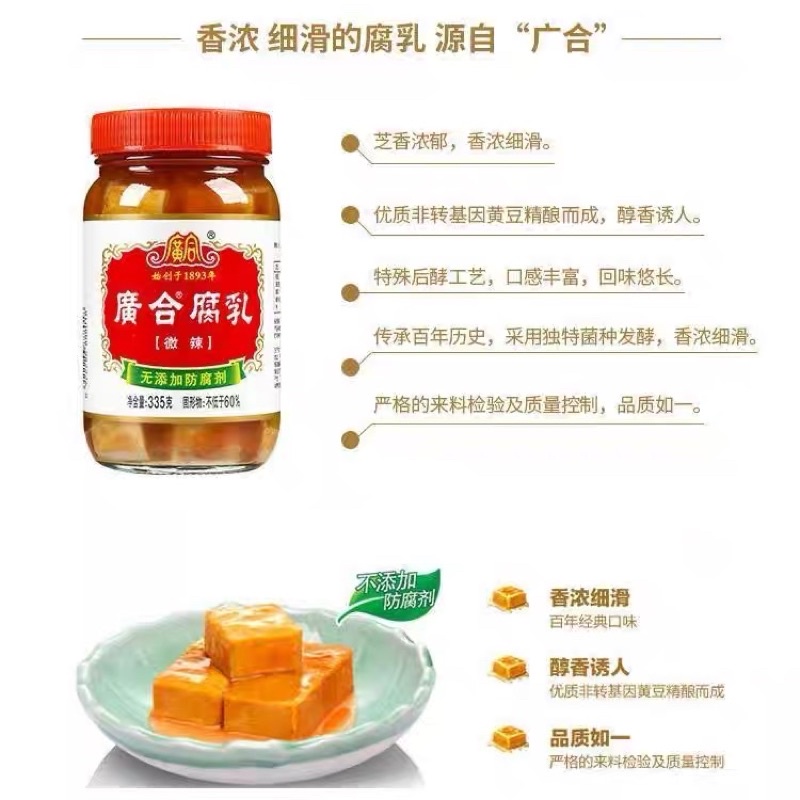 เต้าหู้ยี้ รสเผ็ดน้อย广合腐乳微辣335g เนื้อเนียนนุ่ม หอมอร่อยกลมกล่อม จะกินคู่กับข้าวเปล่า/ข้าวต้ม/ก๋วยเตี๋ยวเย็นตาโฟก็อร่อย