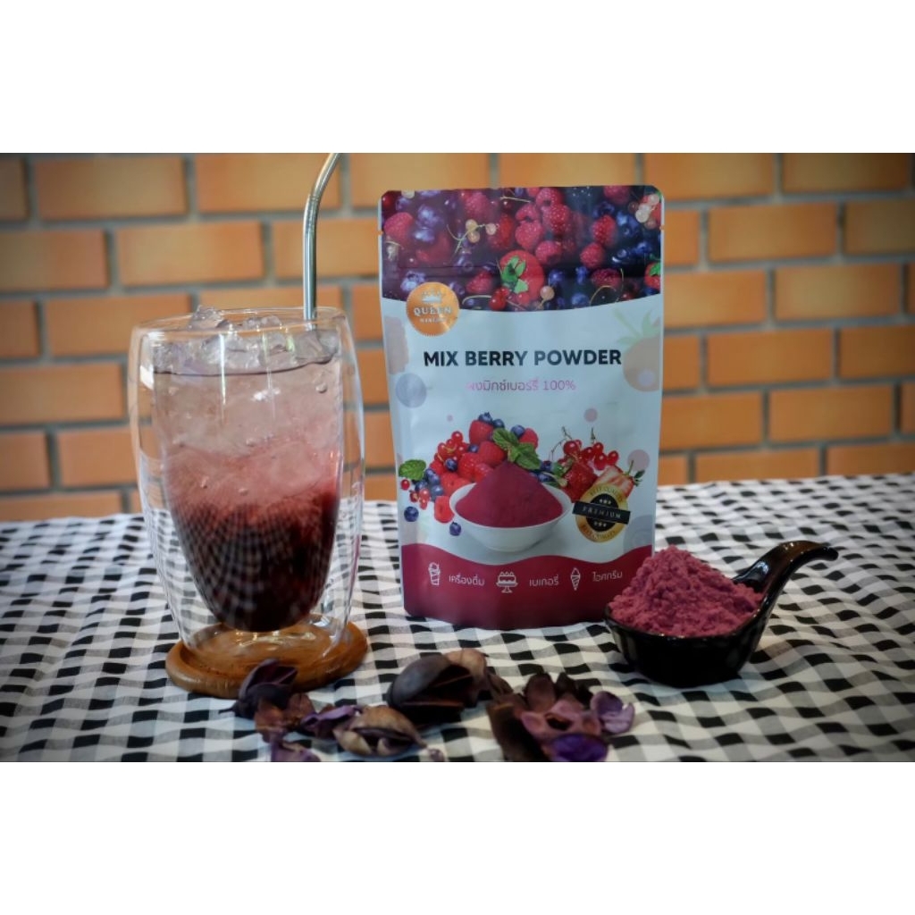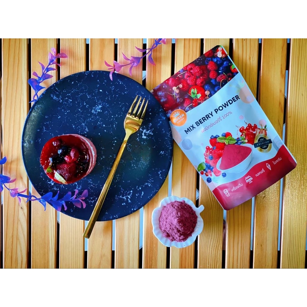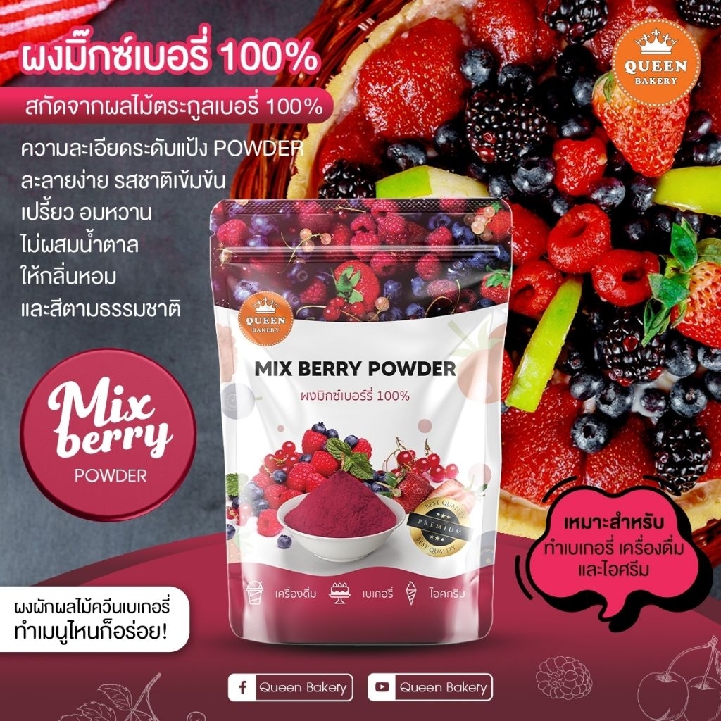 ผงมิ๊กซ์เบอรี่ 1,000 g แบรนด์ควีนำเบเกอรี่ เป็นถุงฟอยล์ติดสติกเกอร์